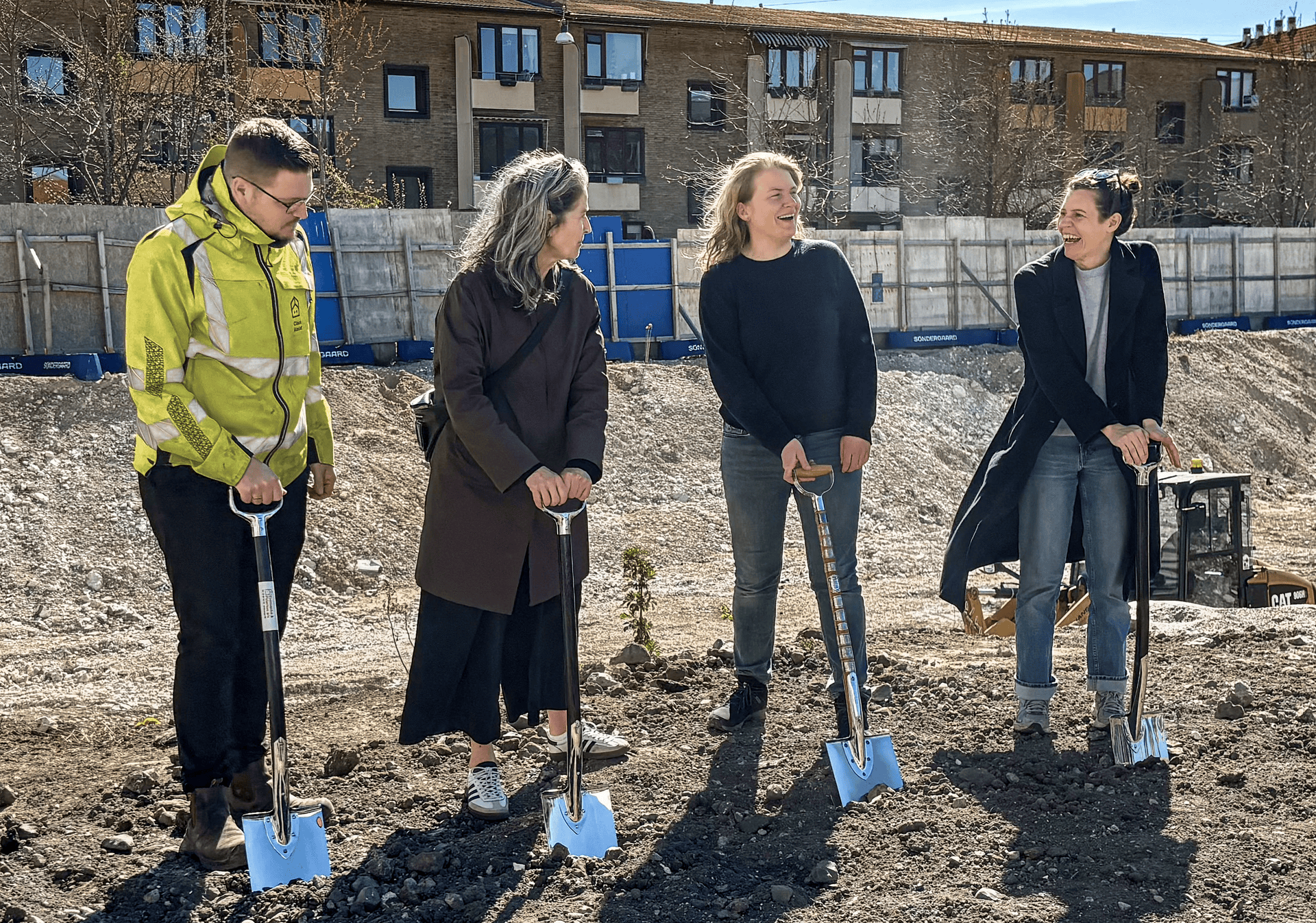 FØRSTE SPADESTIK til Botilbud Ellebjergvej i København SV blev markeret i solskin, hvor Claus Aaslet fra E&P, Socialborgmester Karina Vestergård Madsen, Jette Sommer Thamdrup fra Byggeri København samt Tina Bejer Jørgensen fra SOF sammen tog fat.
