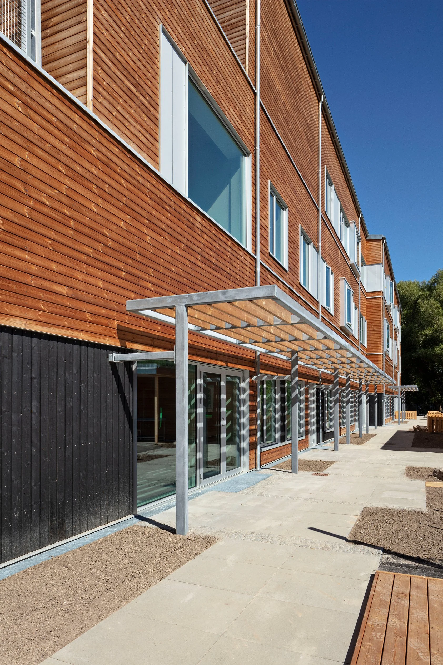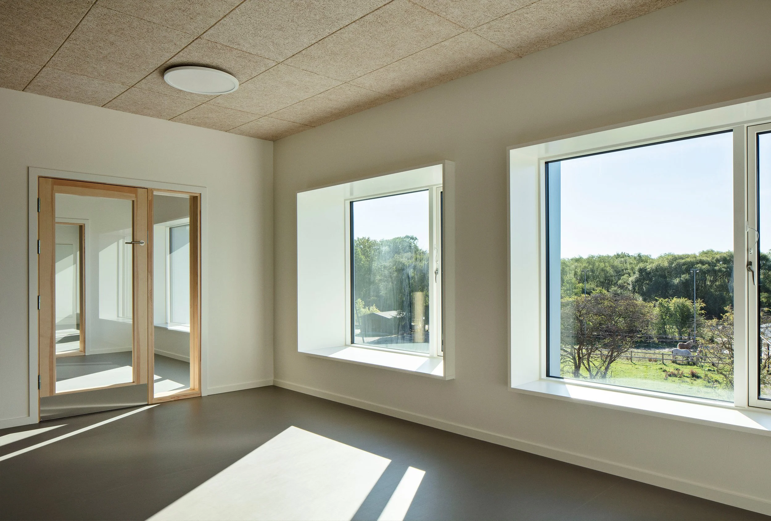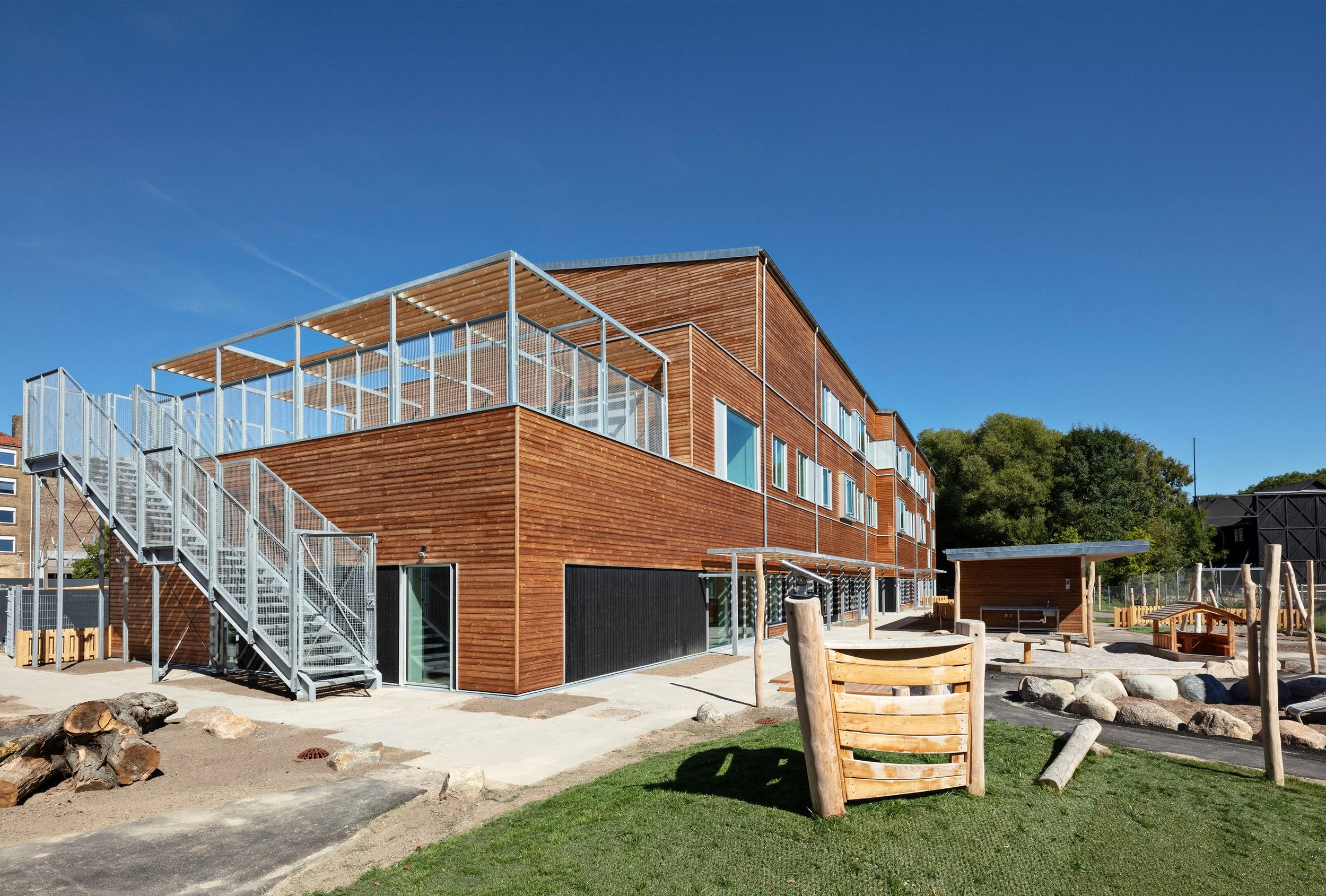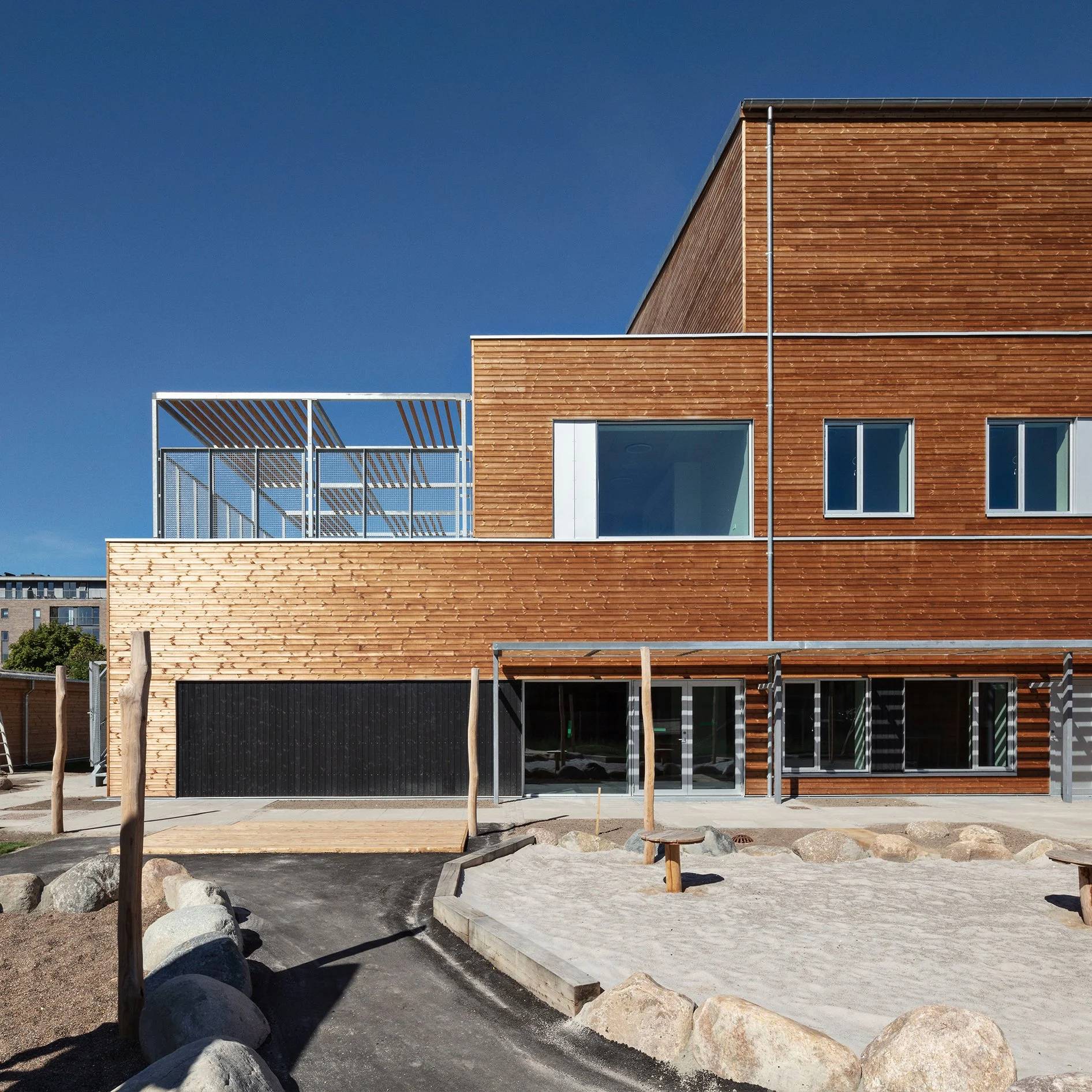 Fællesrummene er placeret central i huset med mulighed for kig på tværs. Puslerum er placeret ved facader med dagslys og vinduer kig til legepladsen, udsigt over fælleden og, nok så vigtigt, muliggør udluftning. De mindste børn sover til middag i bygningsintegrerede liggehaller med store åbninger i facaden, der giver naturlig udluftning. Institutionen er opført i lette elementer med træbeklædning. De første børn flyttede ind i september 2022.