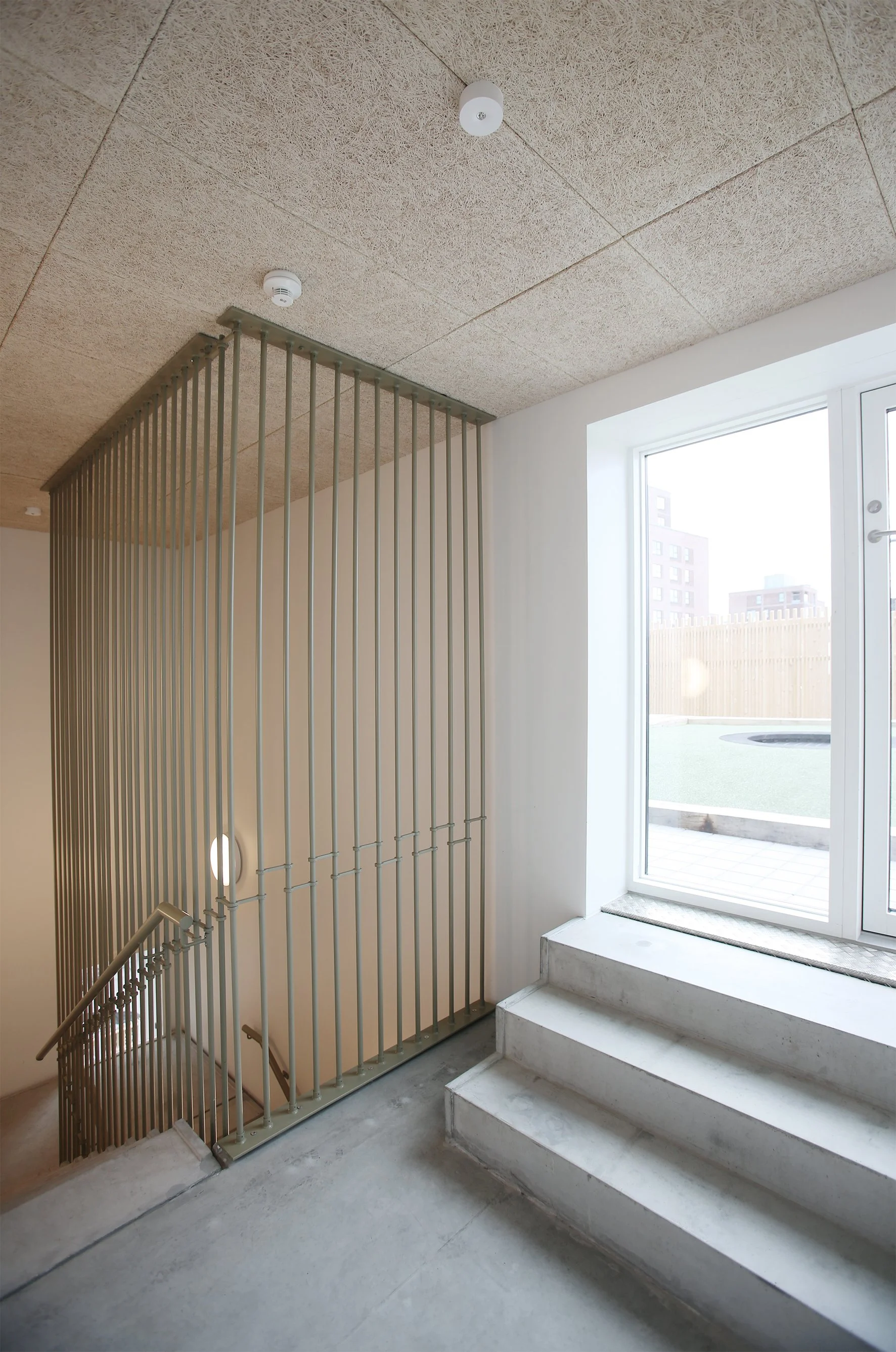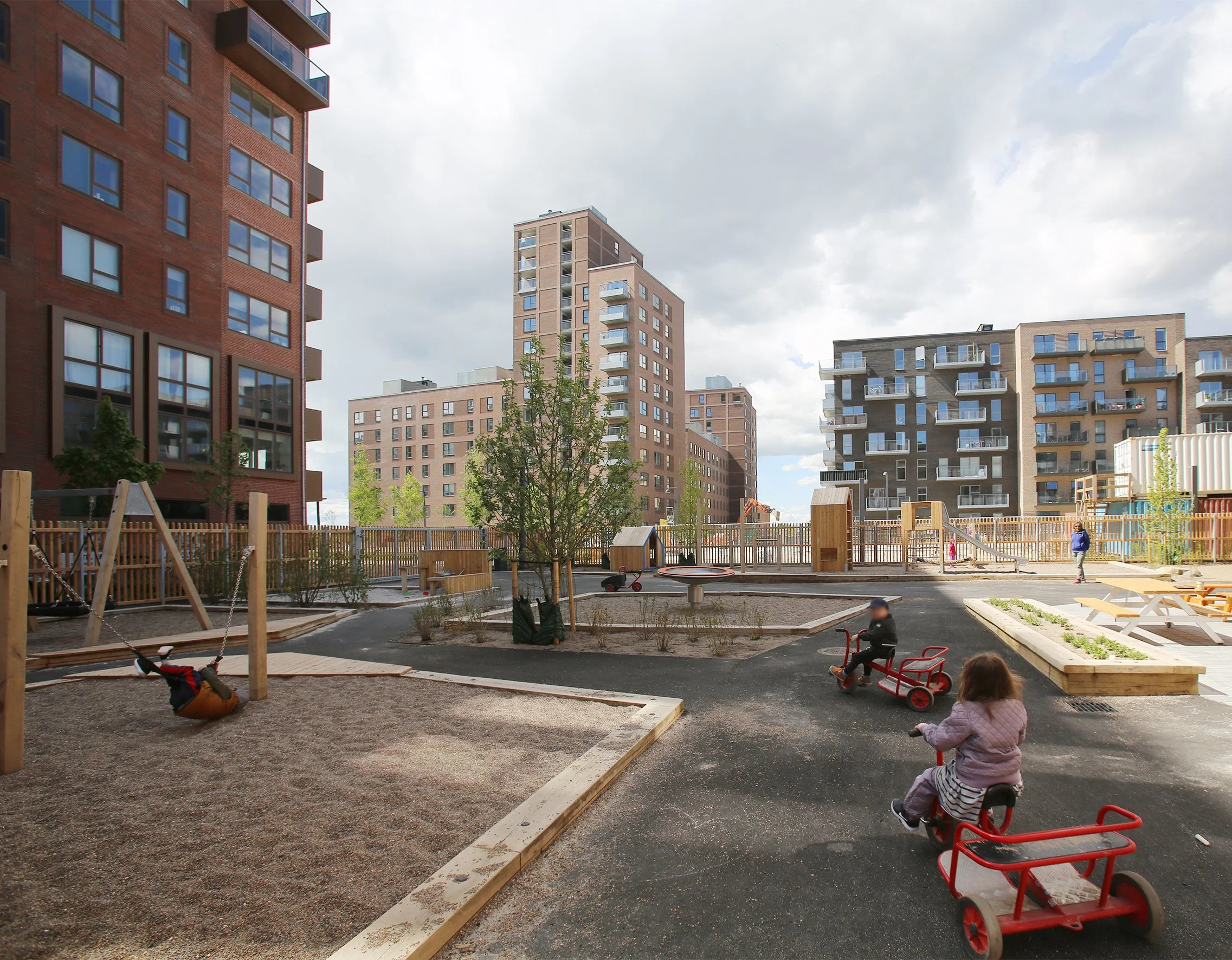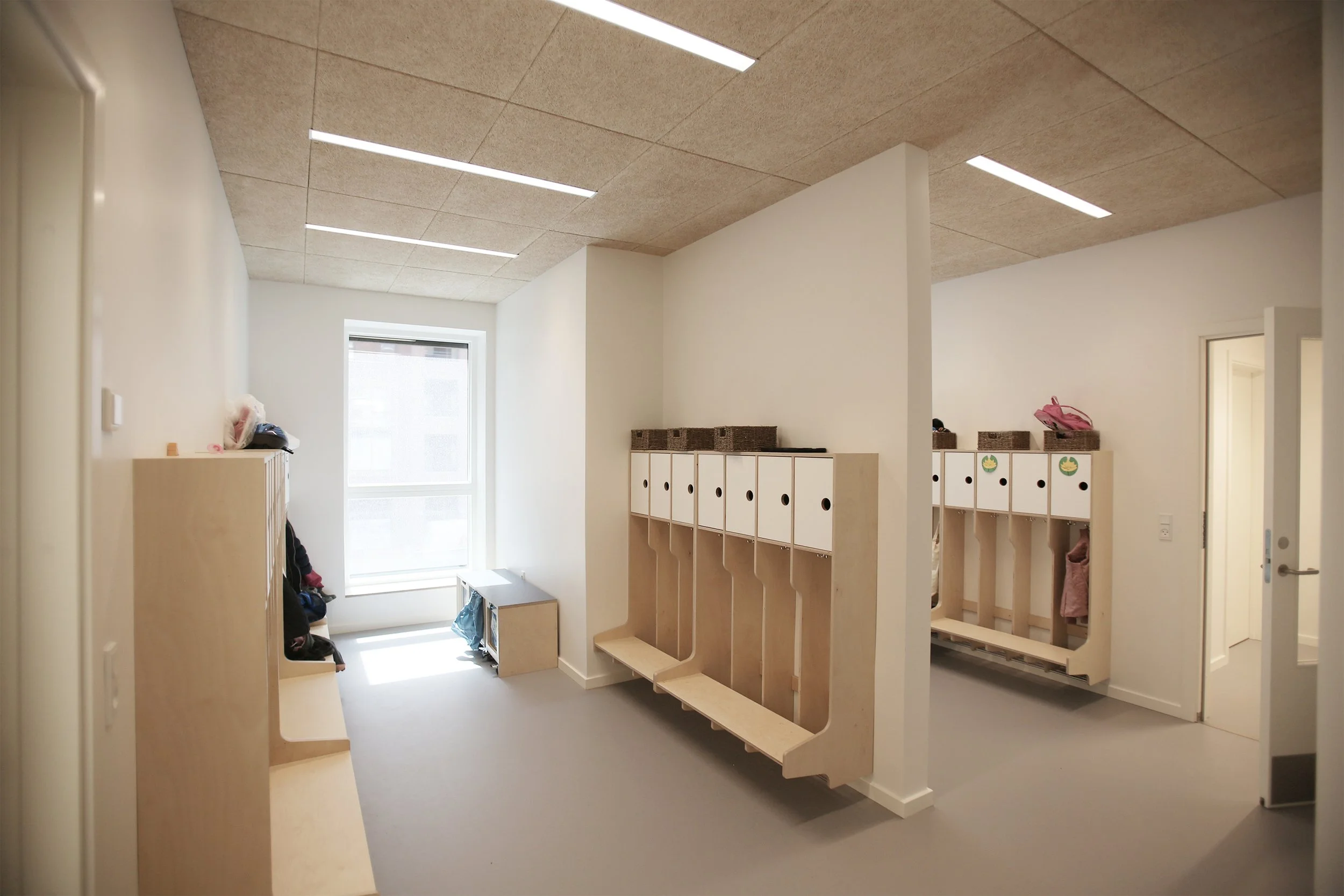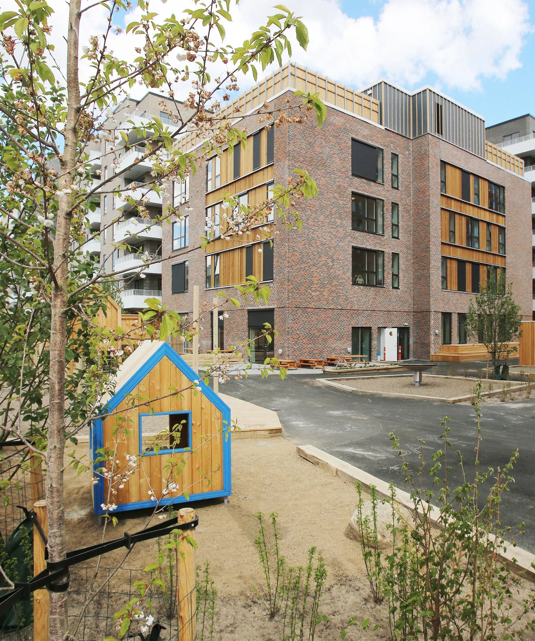 Tagterrassen er opdelt i to legeområder med to trappe- og elevatorbygninger, der sikrer flugt og niveaufri adgang til terræn. Udearealer på terræn er opdelt i forskellige aktivitetsområder, hvor der langs bygningsfacaden er etableret opholdszoner, der relaterer sig til de bagvedliggende rum. Langs hjørnegrundens periferi ligger forskellige mere aktive og larmende aktiviteter. Aktiviteterne formidles af et belagt areal med mulighed for kørsel med cykel og mindre legeredskaber.
