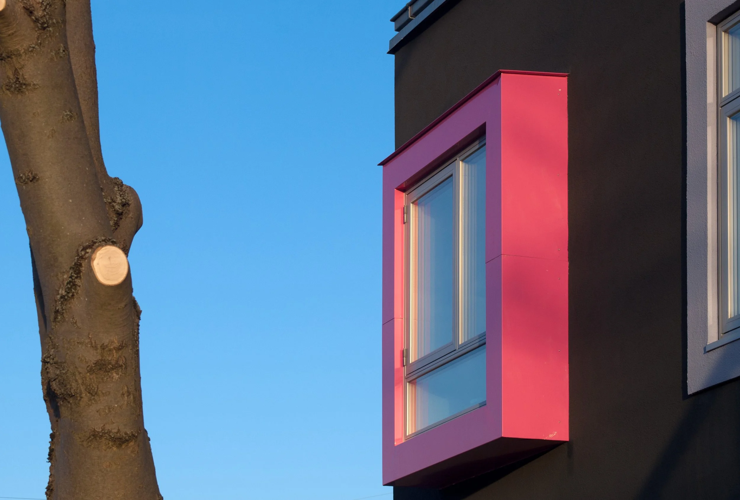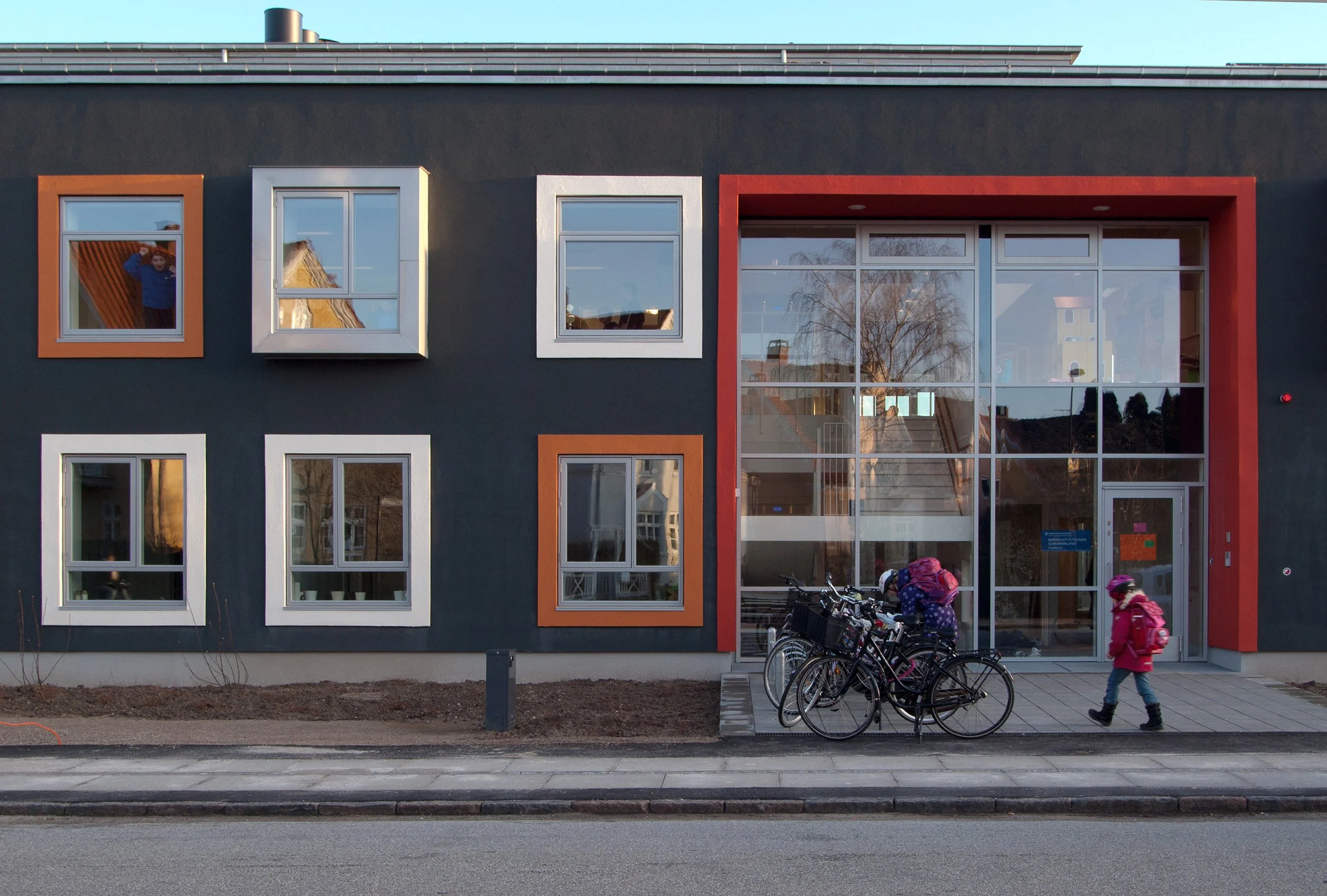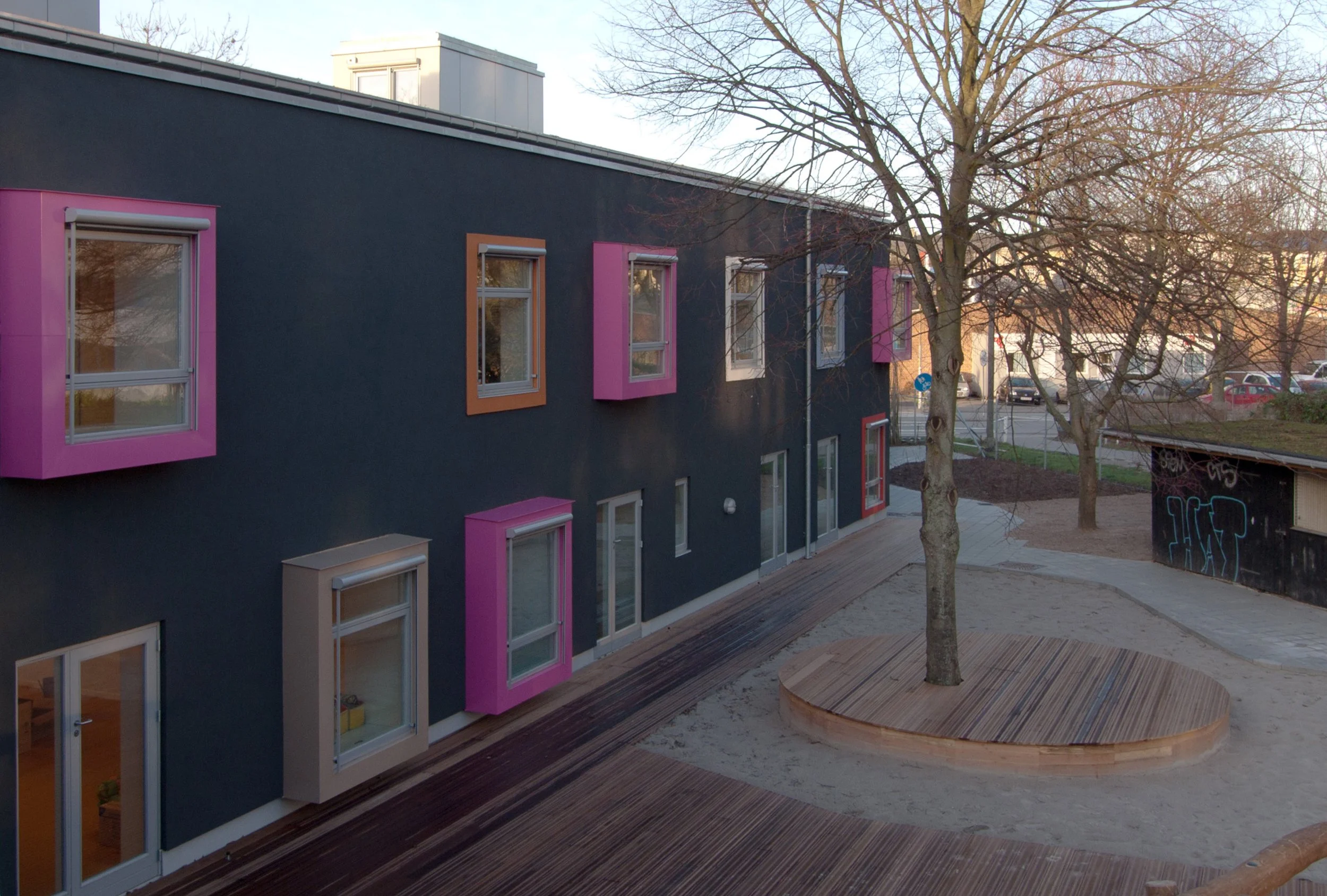Institutionen er opført over to etager som et overgangsvolumen mellem villaområdet, de store boligblokke og Vigerslev Allés Skole. I institutionens facade fortolkes det nærliggende og bevaringsværdige villaområdes motivverden med farvede pudsede facader, mange ensartede vinduesformater, samt små mangefarvede karnapudbygninger.