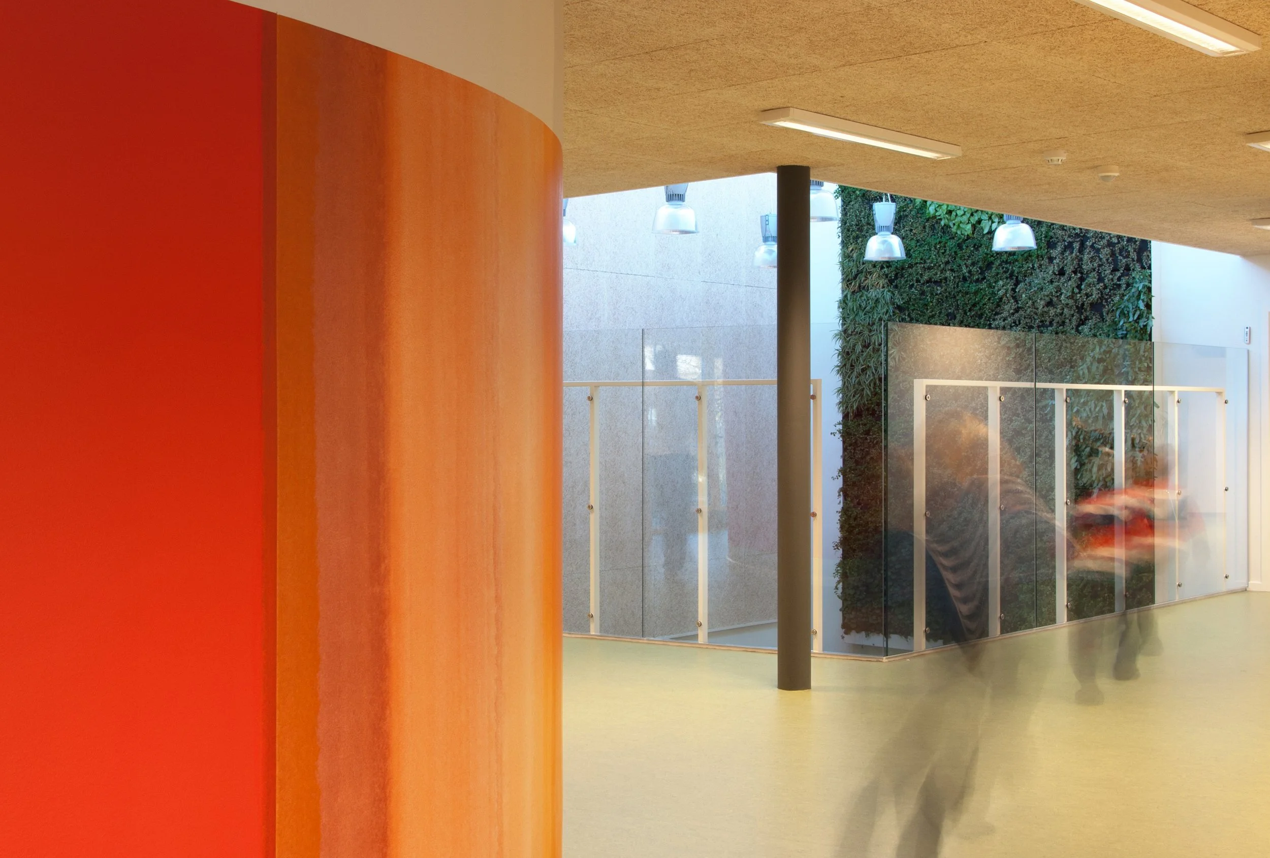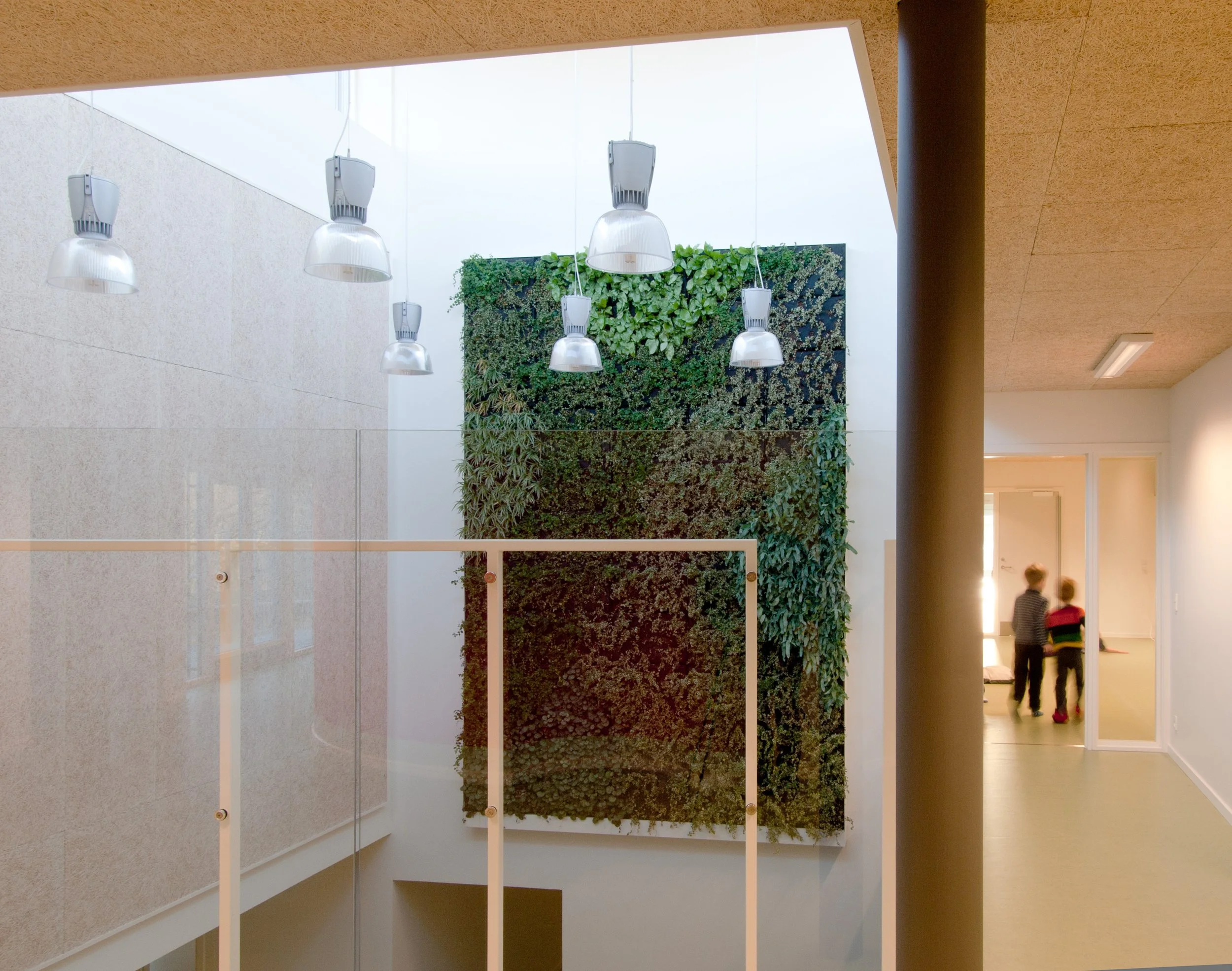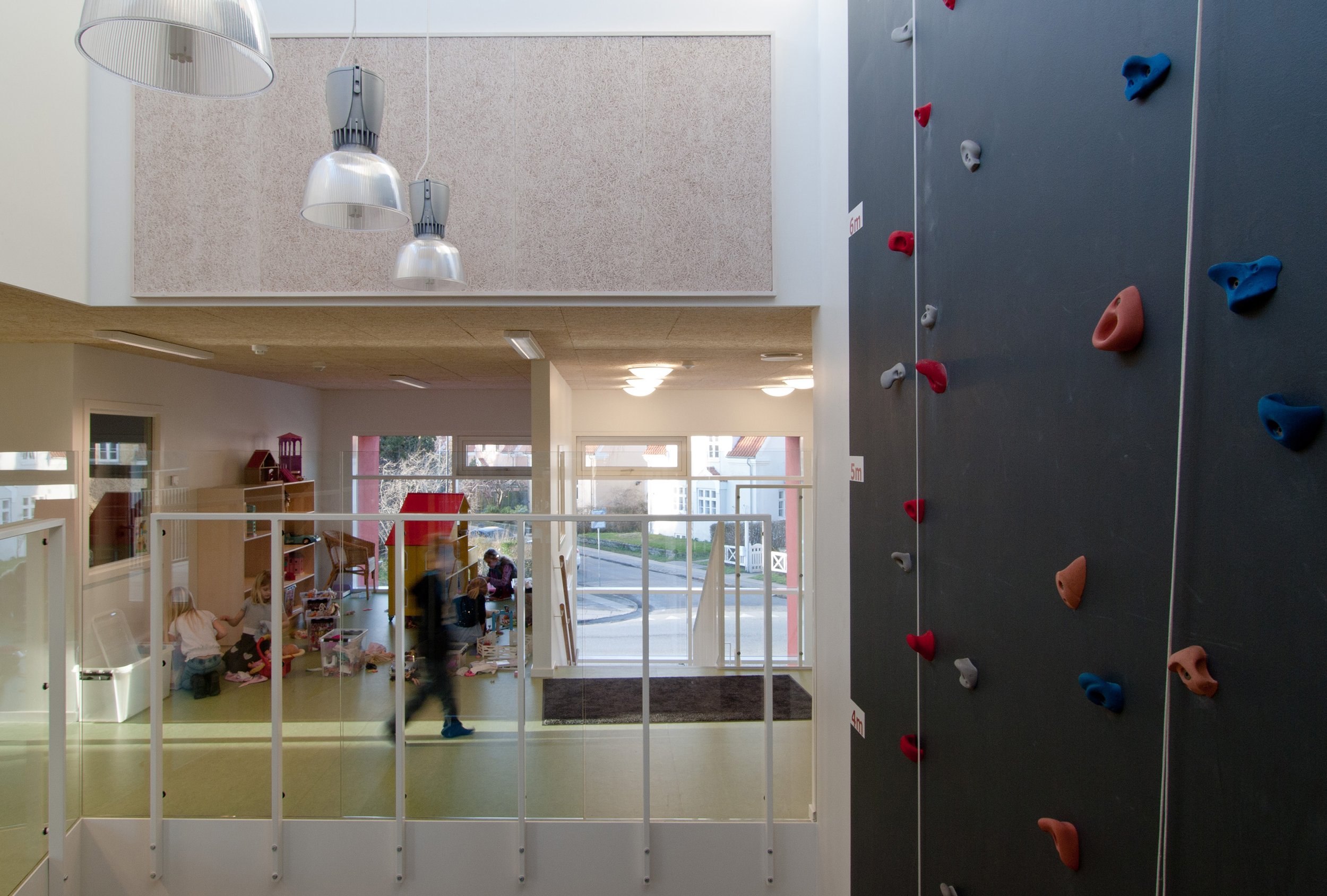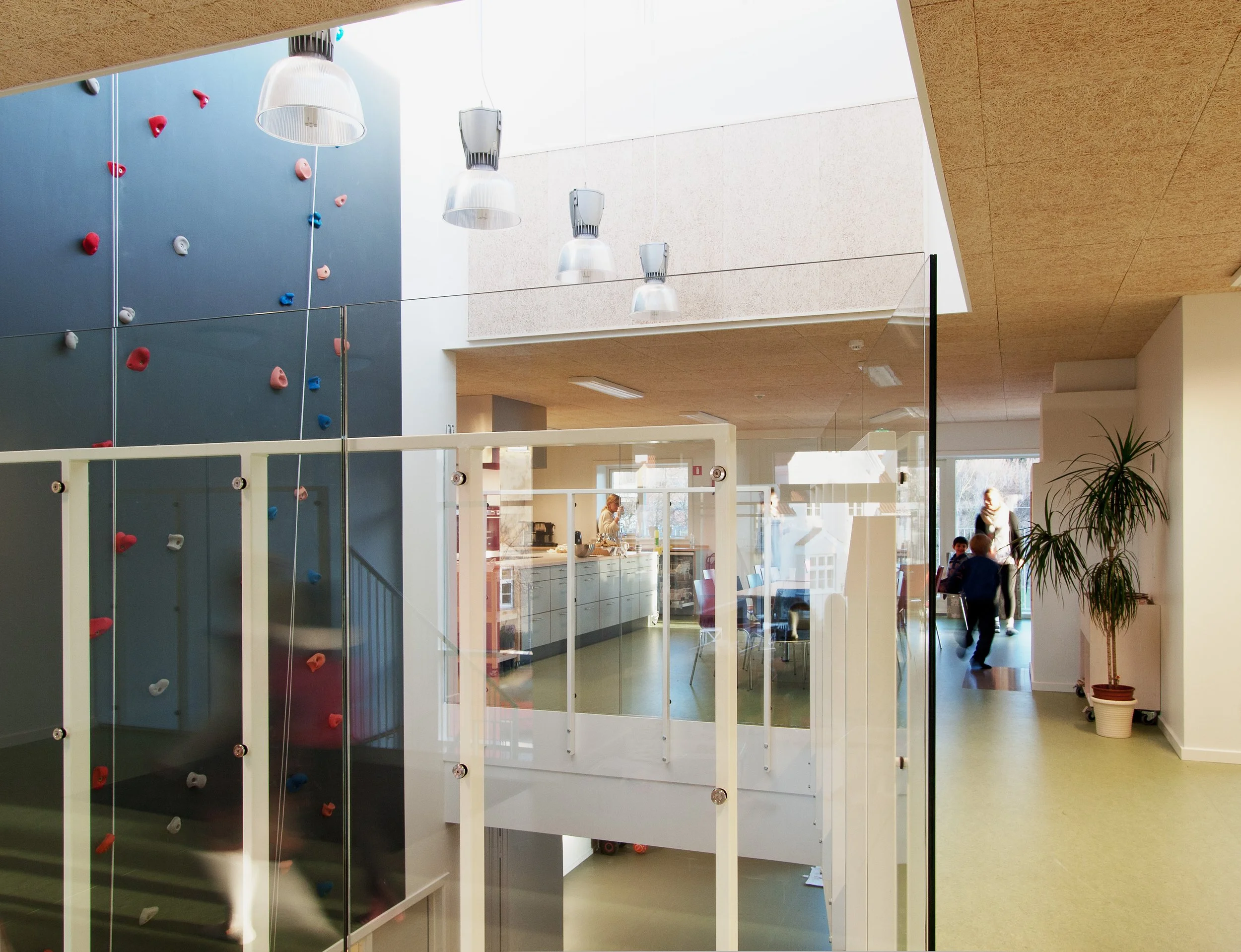 Der er indendørs arbejdet med mange forskellige rumligheder og funktioner, som inspirerer til fordybelse og hygge, til værkstedsarbejde og ikke mindst til leg, idræt og bevægelse, f.eks. ved en indendørs klatrevæg, dobbelthøje rum, små nicher og kroge, runde rum og hemse. Der er i udformningen arbejdet med at skabe rumligheder, der udvikler hvert enkelt barns potentiale - og skaber grobund for at inkludere børn med diagnoser i fællesskabet