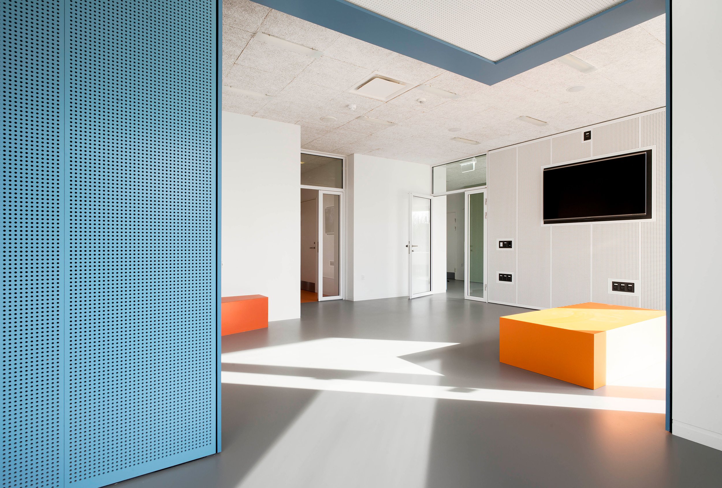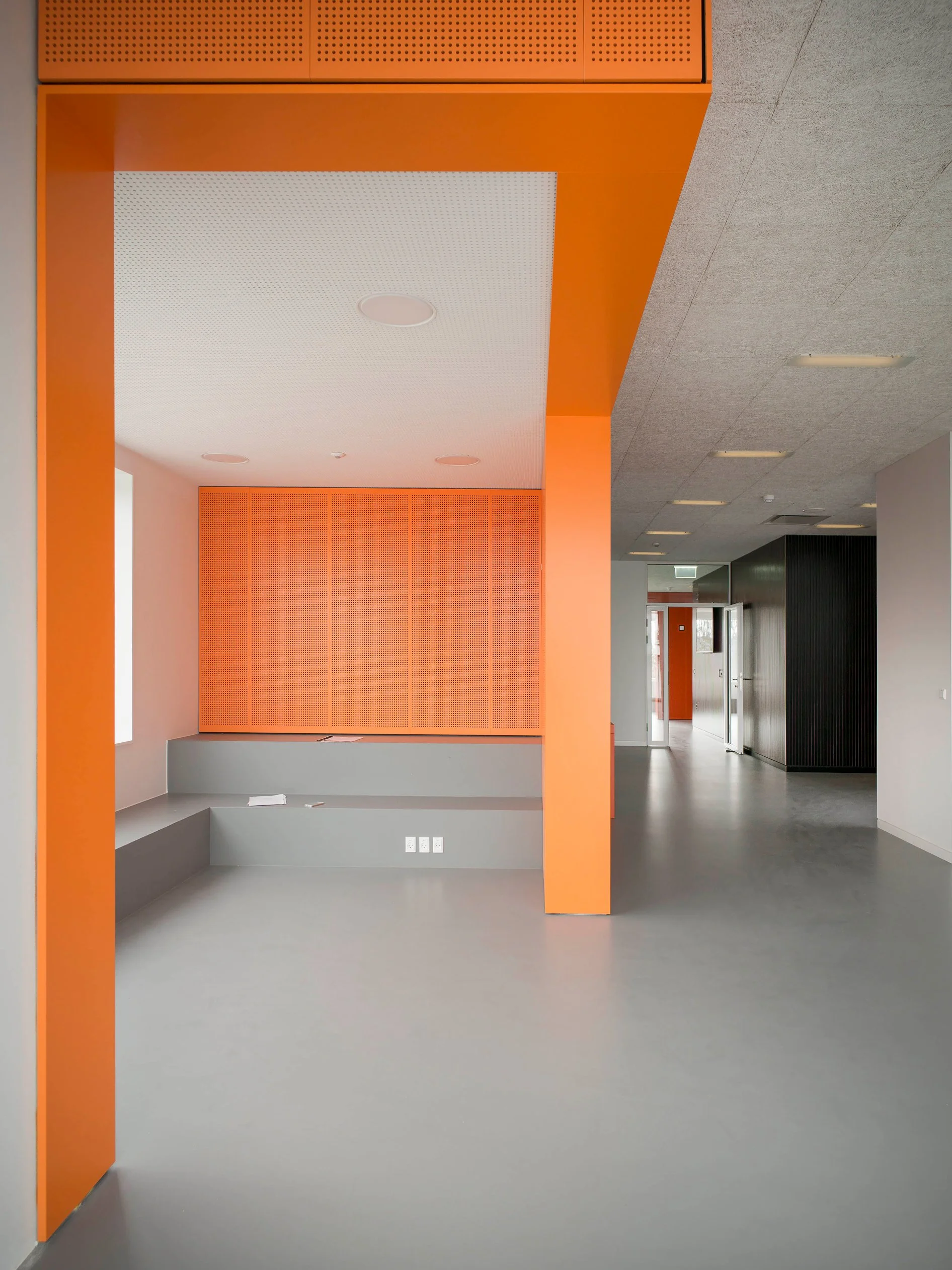 Fraværet af møbler gør, at indretningen sker med kroppen og ikke er tvunget af fysiske rammer udover rummene i sig selv. Akustisk er der arbejdet nøje med lyd, så den overalt er dæmpet så meget som muligt.