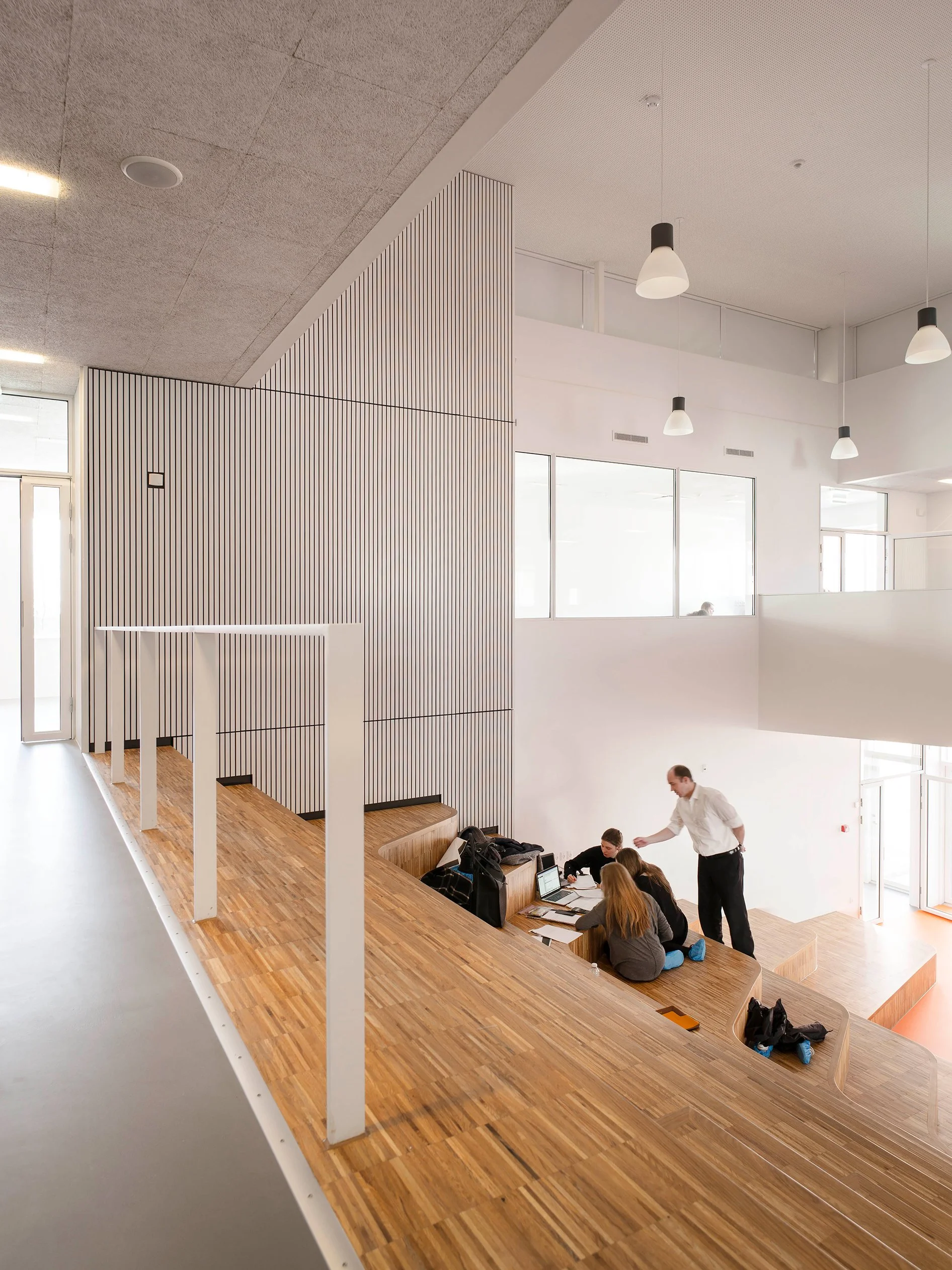 Med det udgangspunkt er bygningen disponeret som en labyrint af større og mindre arbejdsrum, som over to etager snor sig rundt om et indre, samlende trappeanlæg, der sammenbinder de to etager. Labyrintens varierede rumlige udformning, med nicher, plinte, faste bænke mv. lægger op til forskellige former for fordybning, individuelt arbejde og gruppearbejde samt mindre fremlæggelser. Indretning, der lægger op til et stille og roligt tempo, og som giver mindelser om at være hjemme og ikke i skolen. Trappeanlægget fungerer både som auditorium ved samling af større hold og som supplerende undervisnings- og opholdsområde for grupper og individer.