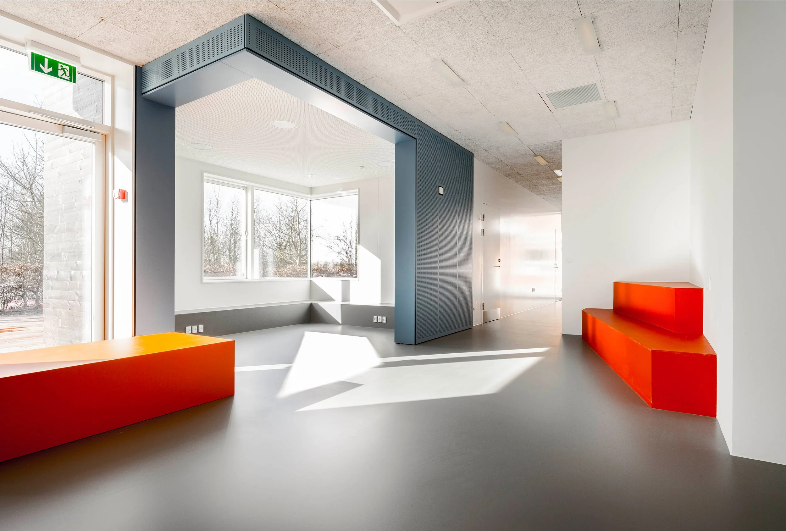 Den nye tilbygning indpasser sig naturligt i den eksisterende bygningsstruktur og danner et samlet bredt ankomstområde, der defineres som en skolegård til ophold og social interaktion. Ankomstområdet suppleres af et aktivitetsområde med markante træmøbler i varierende højder, som fortsætter den interiøre tankegang med plinte og plateauer, så undervisningen også kan foregå udendørs med naturlige overgange fra inde til ude.