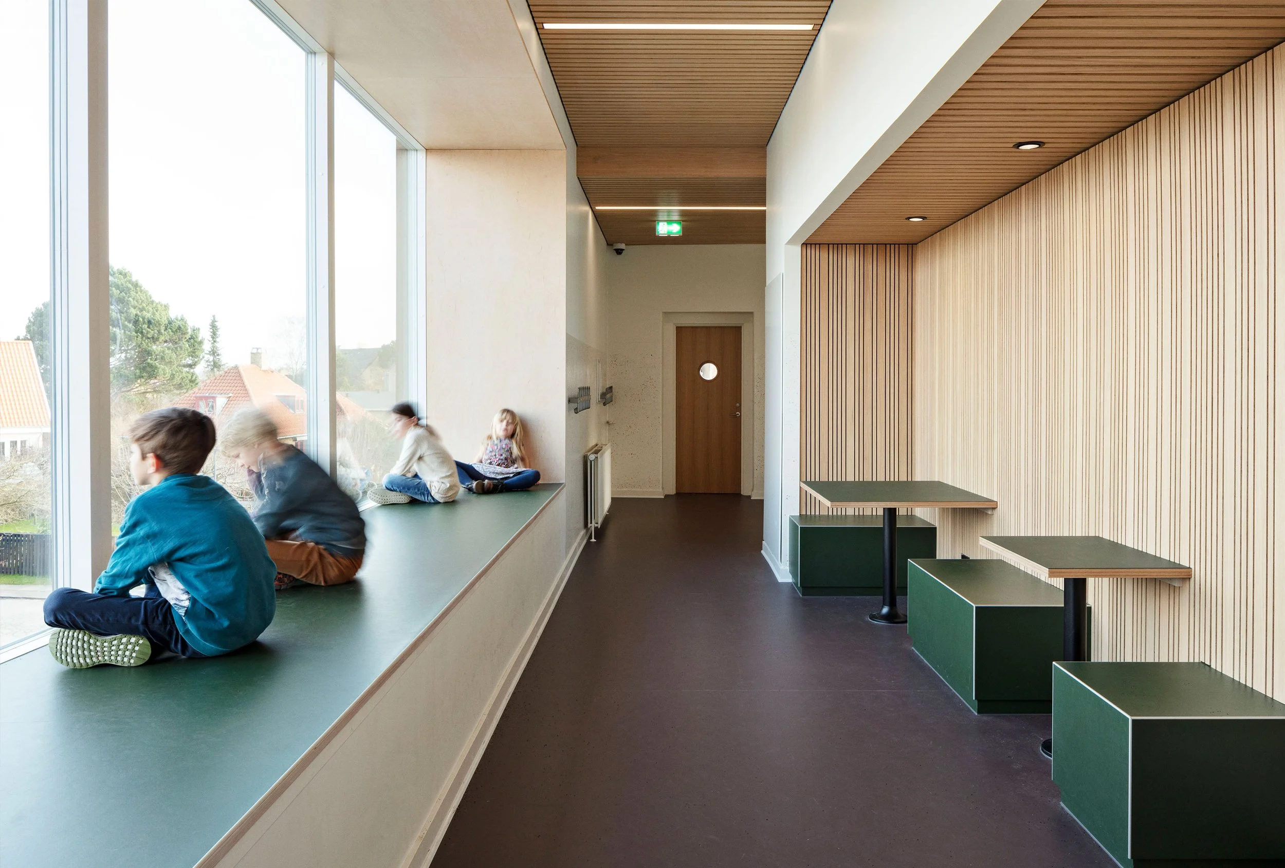 Skolens højtsiddende vinduer mod nord begrænsede tidligere udsynet for eleverne og fik facaden til at fremstå lukket. Med nyetablerede karnapper kan børnene nu sidde og se ud på verden. Karnapperne giver plads til ophold på gangarealerne samtidig med, at skolen har fået et mere åbent og imødekommende udtryk.