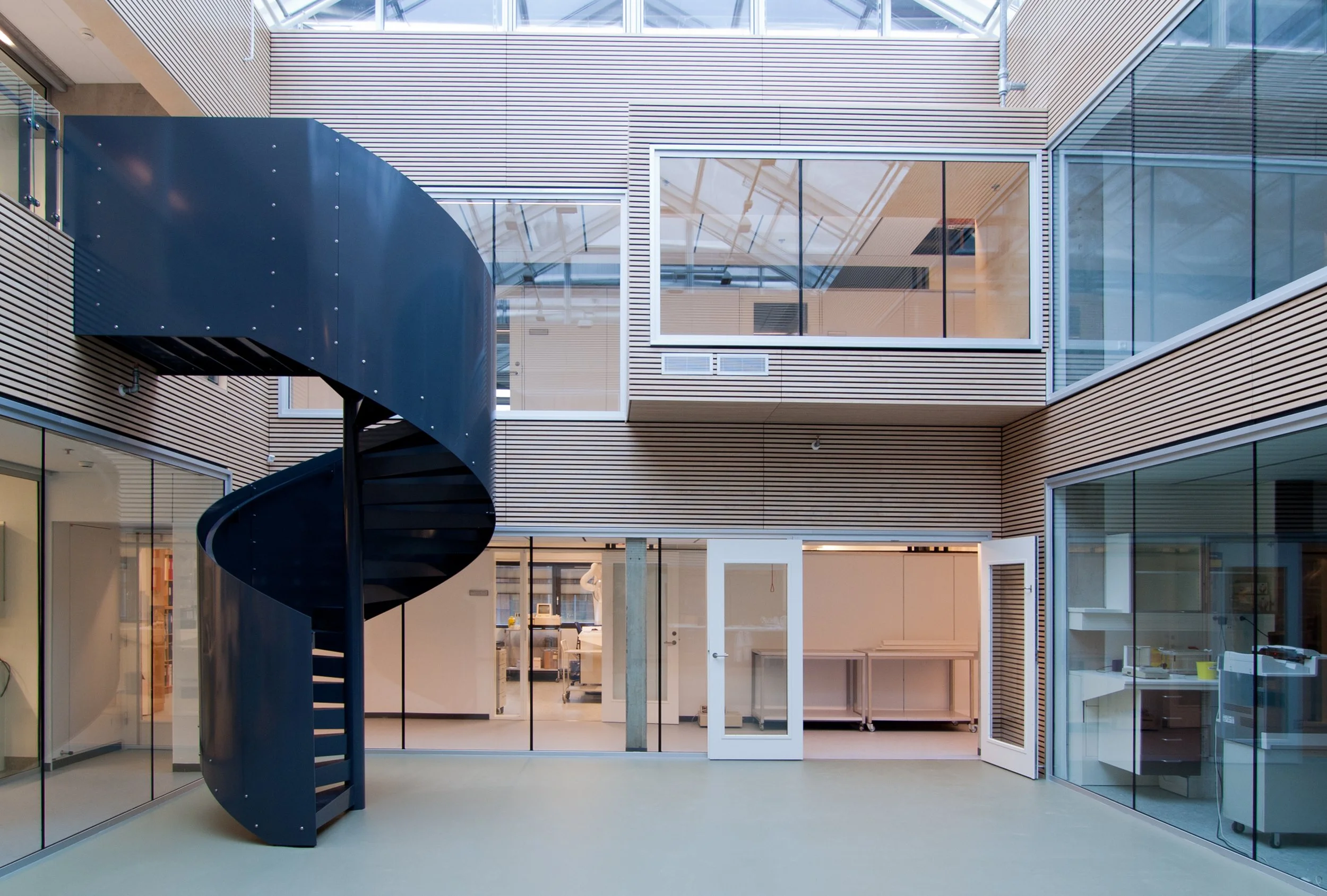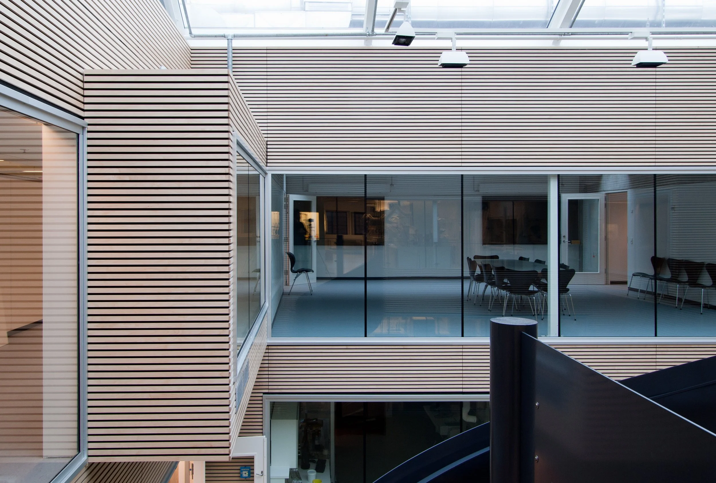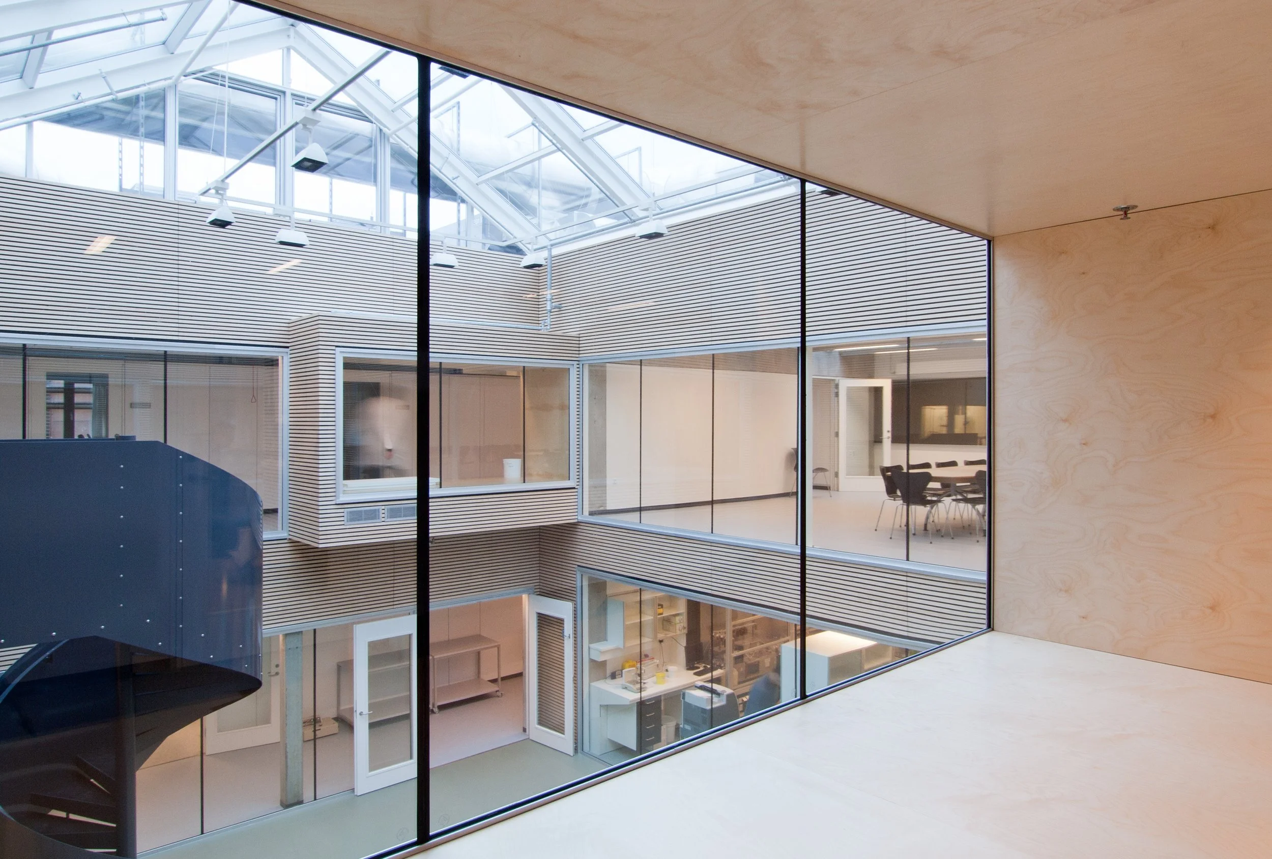 Således er inde liggende gårdrum overdækket og ombygget til fælles opholdsområder, såkaldte Forskertorve, for instituttets ansatte og studerende. En enkel arkitektonisk og funktionel løsning hvor vi har imødekommet behovet for centrale fællesområder uden at gå på kompromis med dagslys og eksisterende arkitektur.