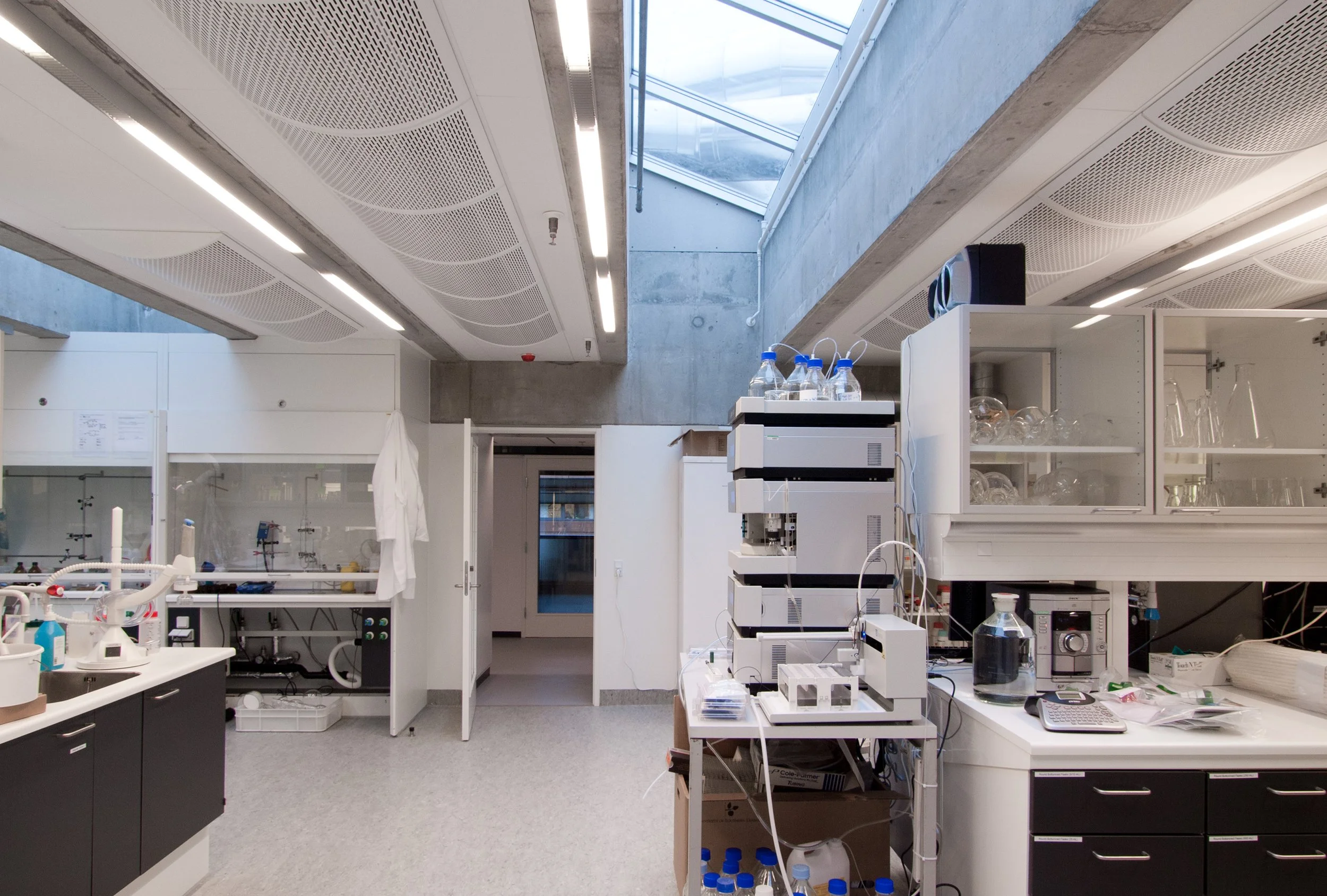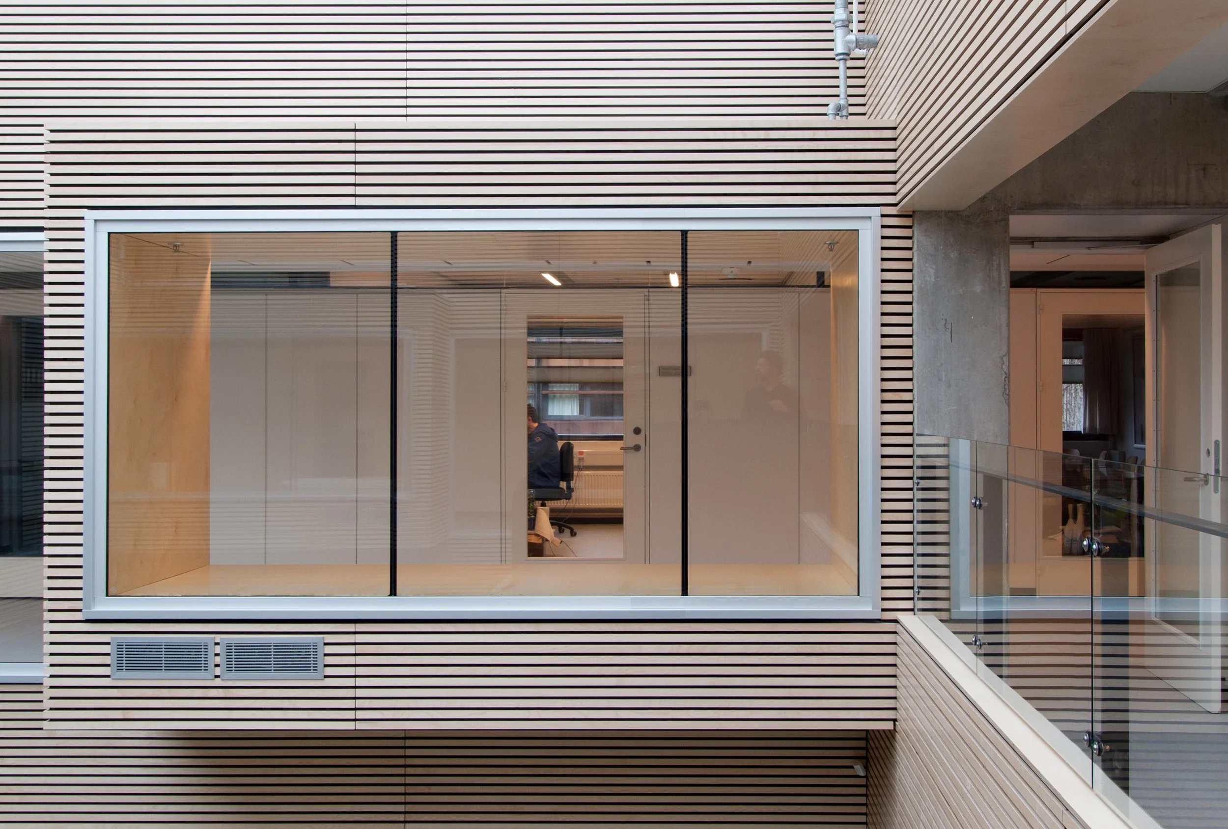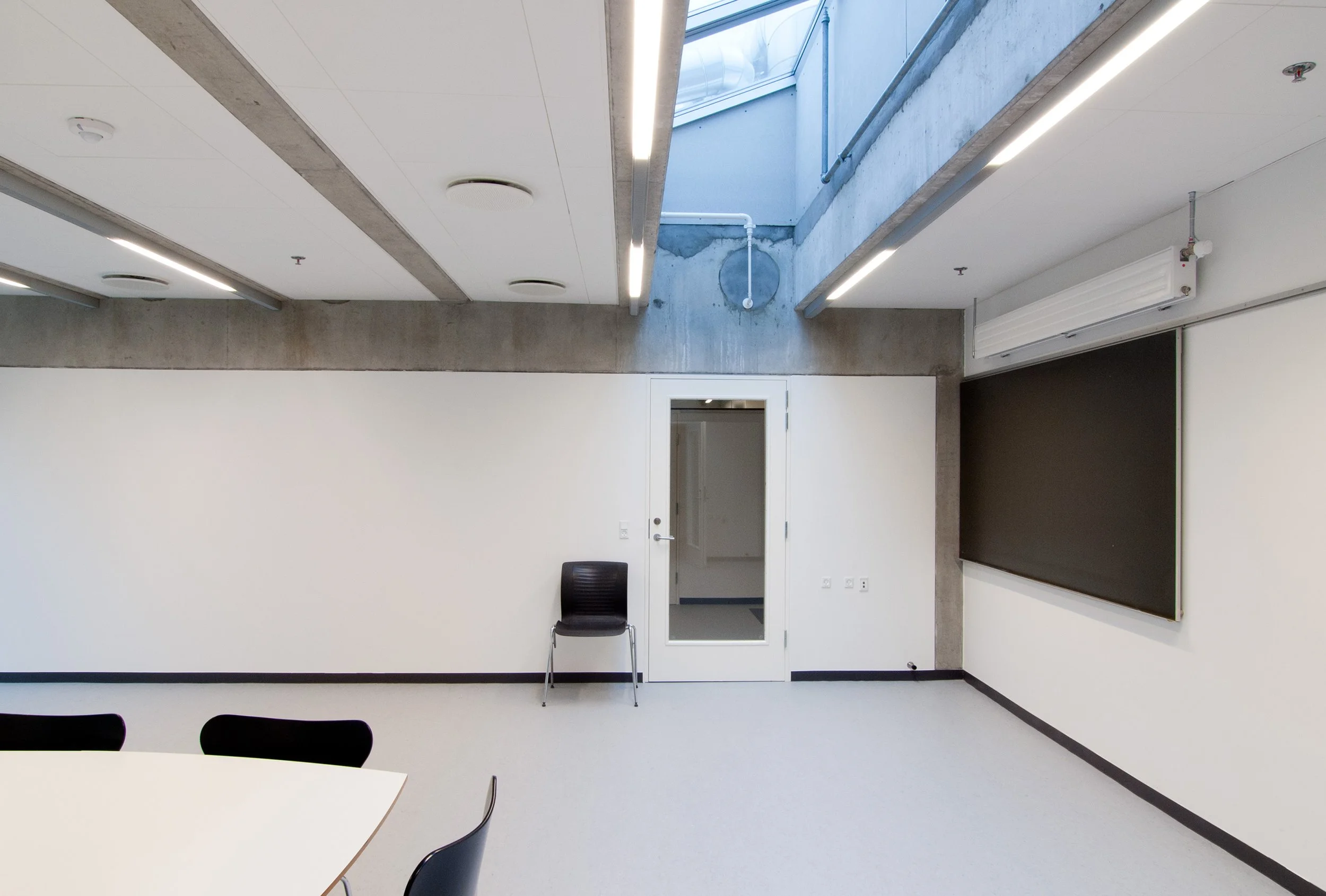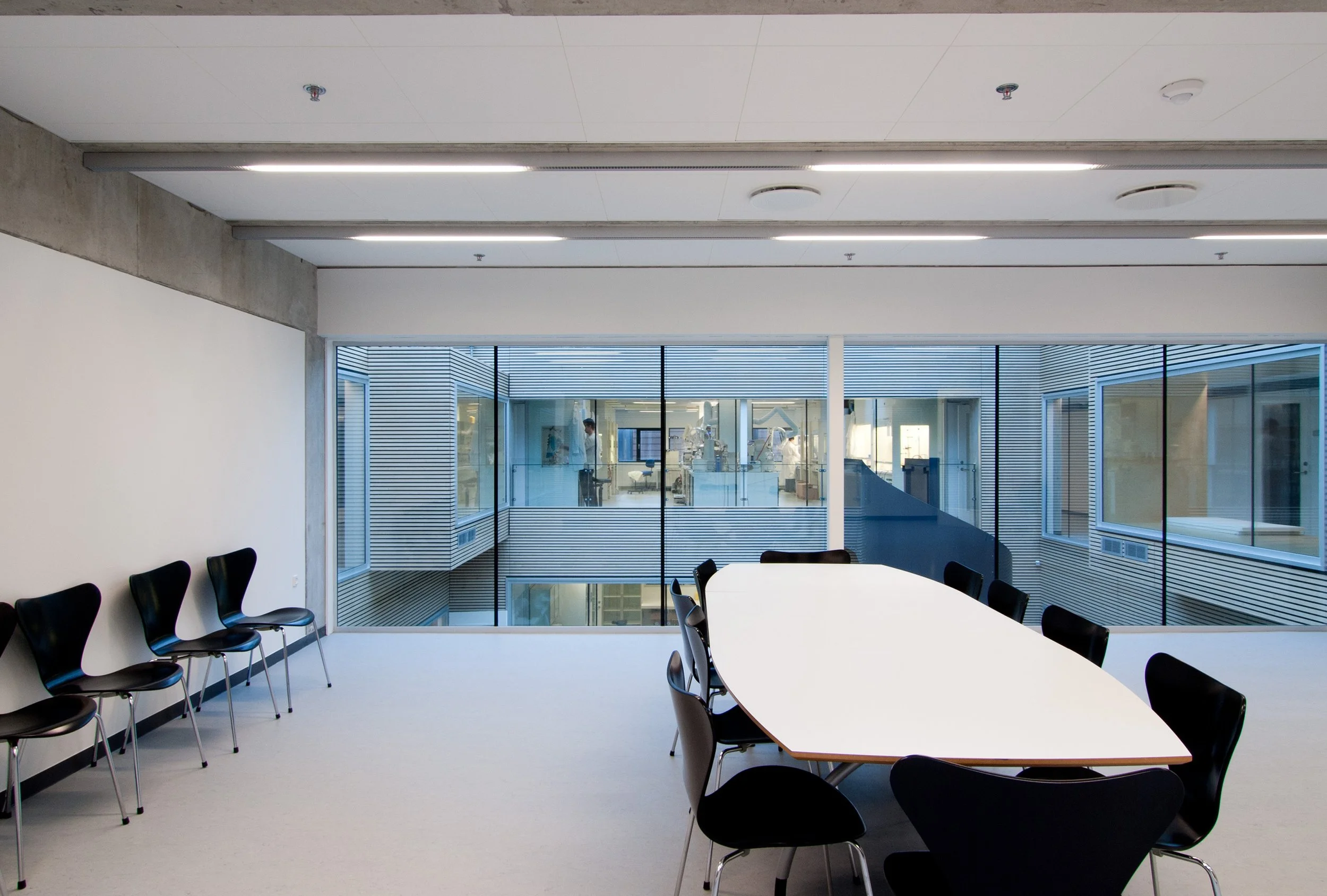 Således er inde liggende gårdrum overdækket og ombygget til fælles opholdsområder, såkaldte Forskertorve, for instituttets ansatte og studerende. En enkel arkitektonisk og funktionel løsning hvor vi har imødekommet behovet for centrale fællesområder uden at gå på kompromis med dagslys og eksisterende arkitektur.