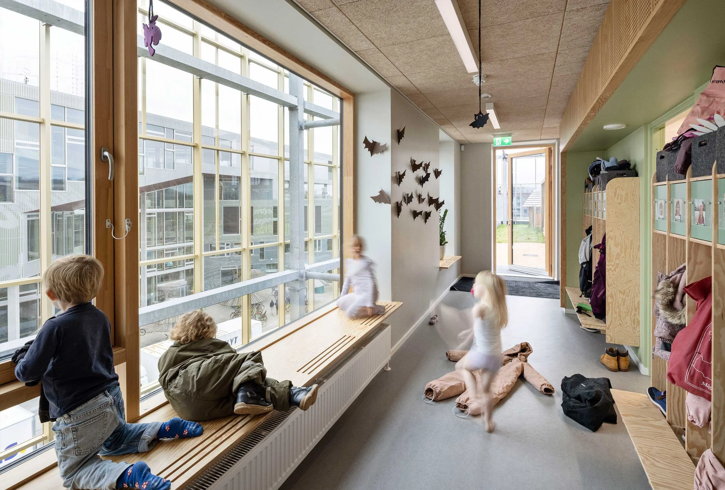 Daginstitutionen er fordelt på de tre øverste etager. Med en aftrapning af bygningen fordeles daginstitutionens 12 grupper ud på 3 terrasser, med egne uderum. På den måde får man automatisk nedskaleret rumlighederne og imødekommer børnene med en alderssvarende skala. Udearealerne på taget til daginstitutionen kaldes væksthaver og bindes arkitektonisk sammen af en stor pergolakonstruktion, der bliver grøn med slyngplanter - på de øverste 'partier' af pergolaen placeres solceller. Over tid vokser planterne sig store og gør væksthaverne til et trygt og grønt uderum.