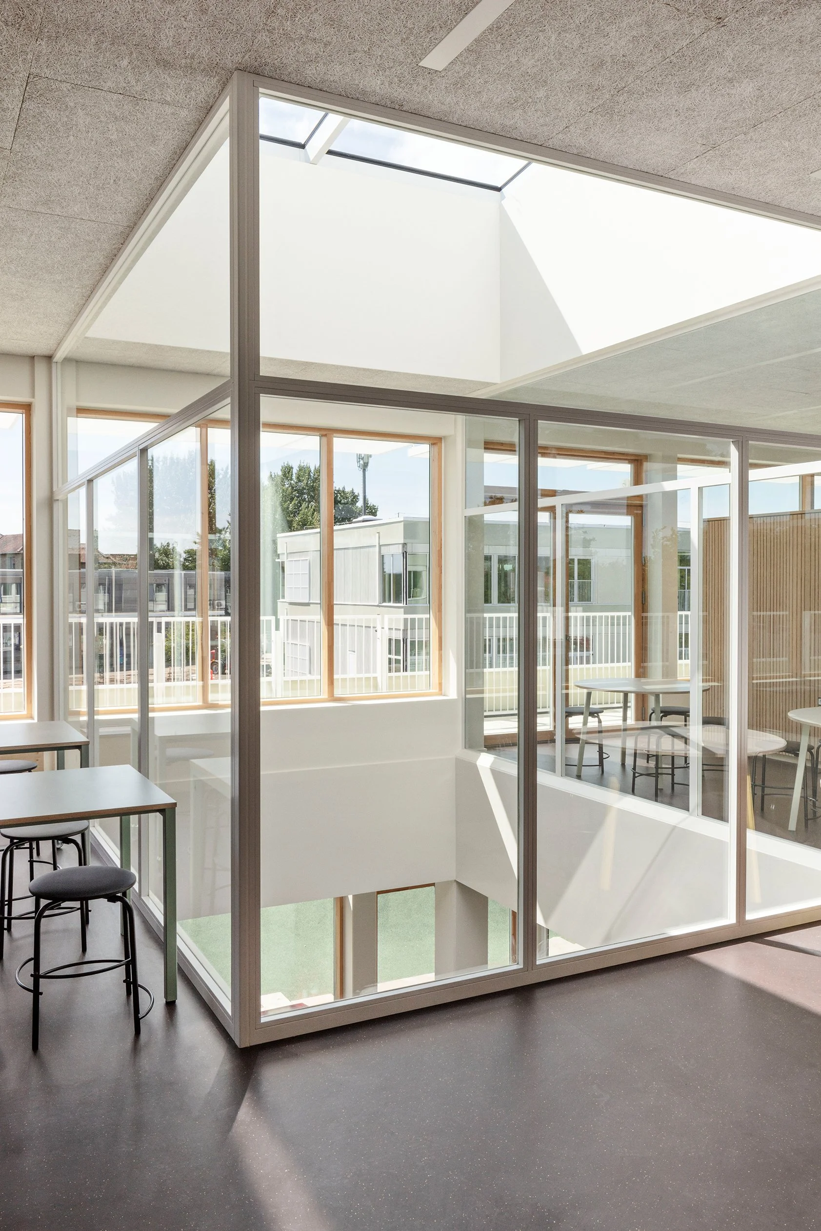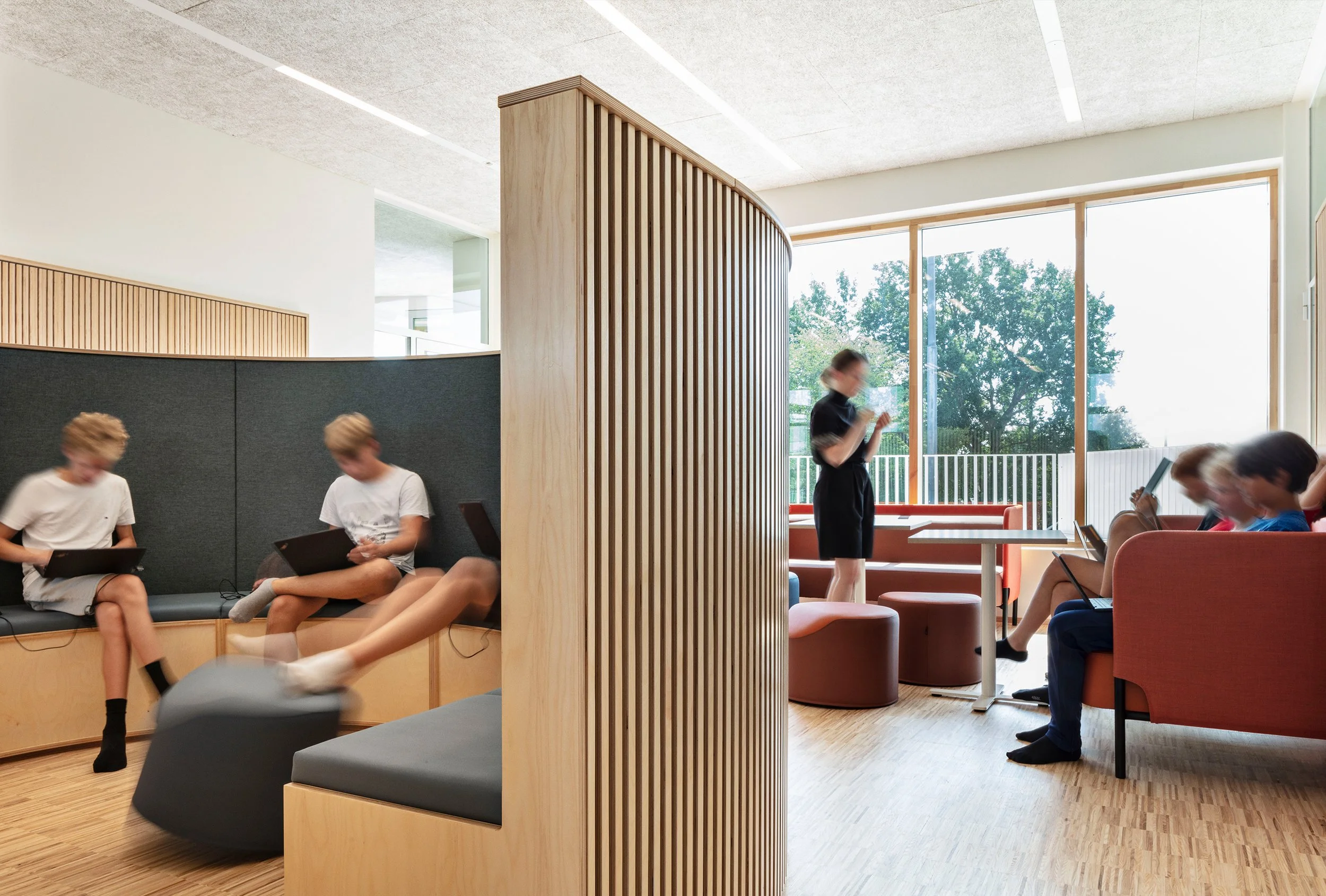 Fællesrummene er forbundet via den centrale trappe, der i stueetagen fungerer som siddetrappe og kan bruges til formidling for en klasse. Rummøbler i fællesrummene skaber små rum i rummene og med glas omkring, er der skabt transparens i bygningen.