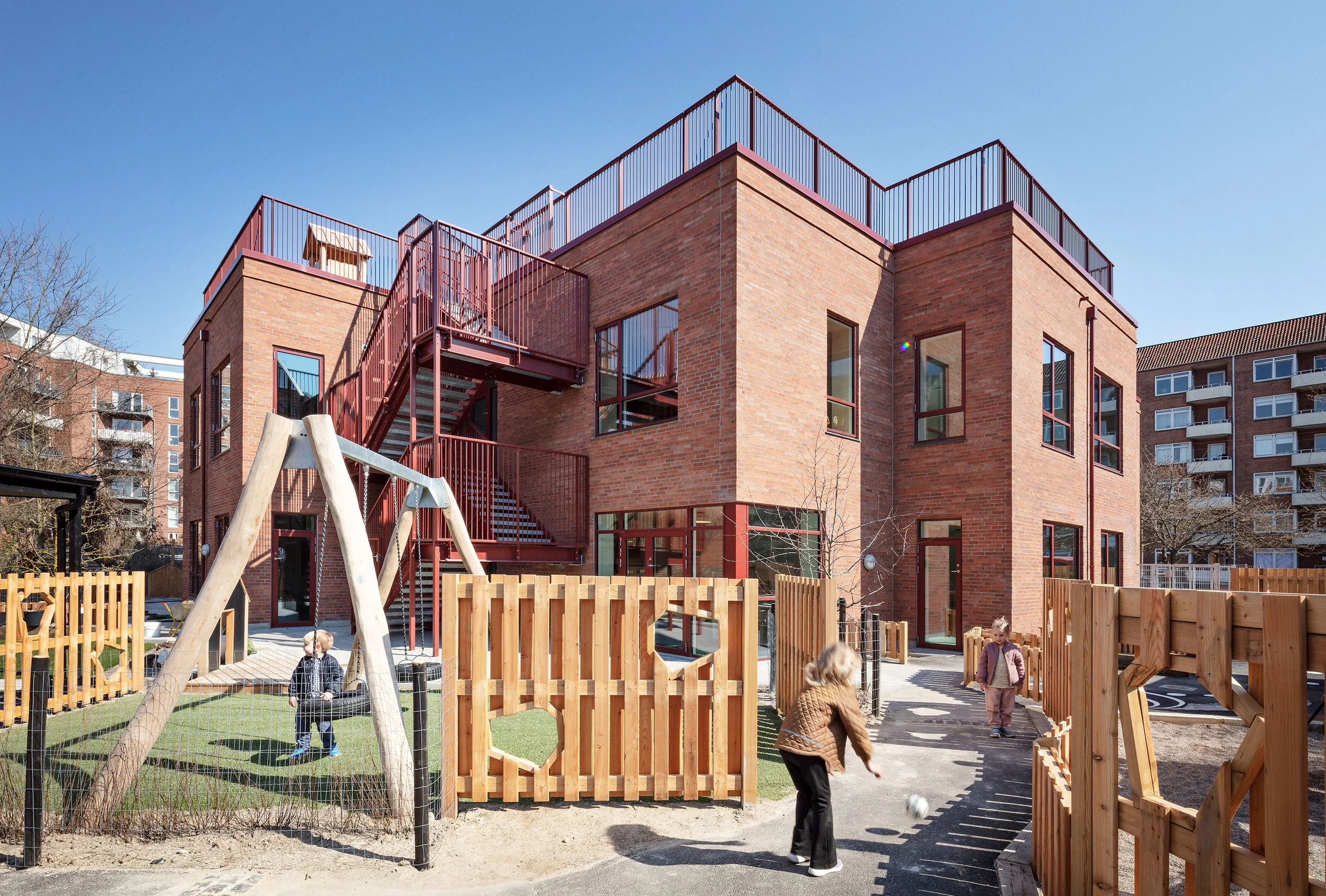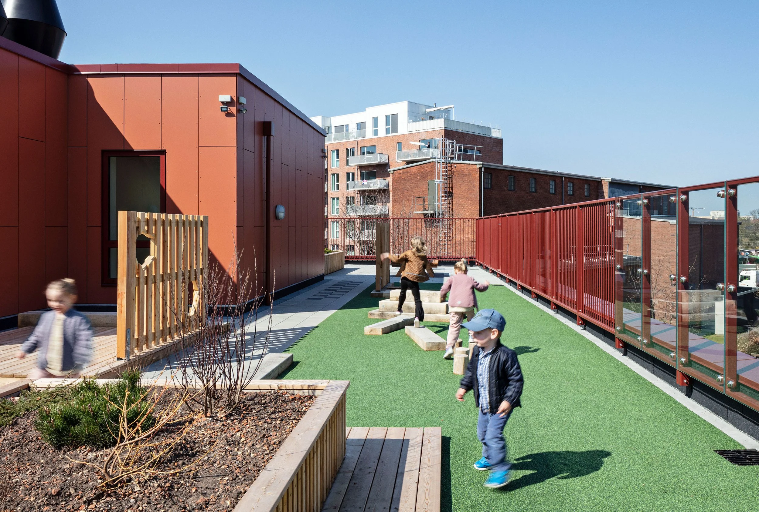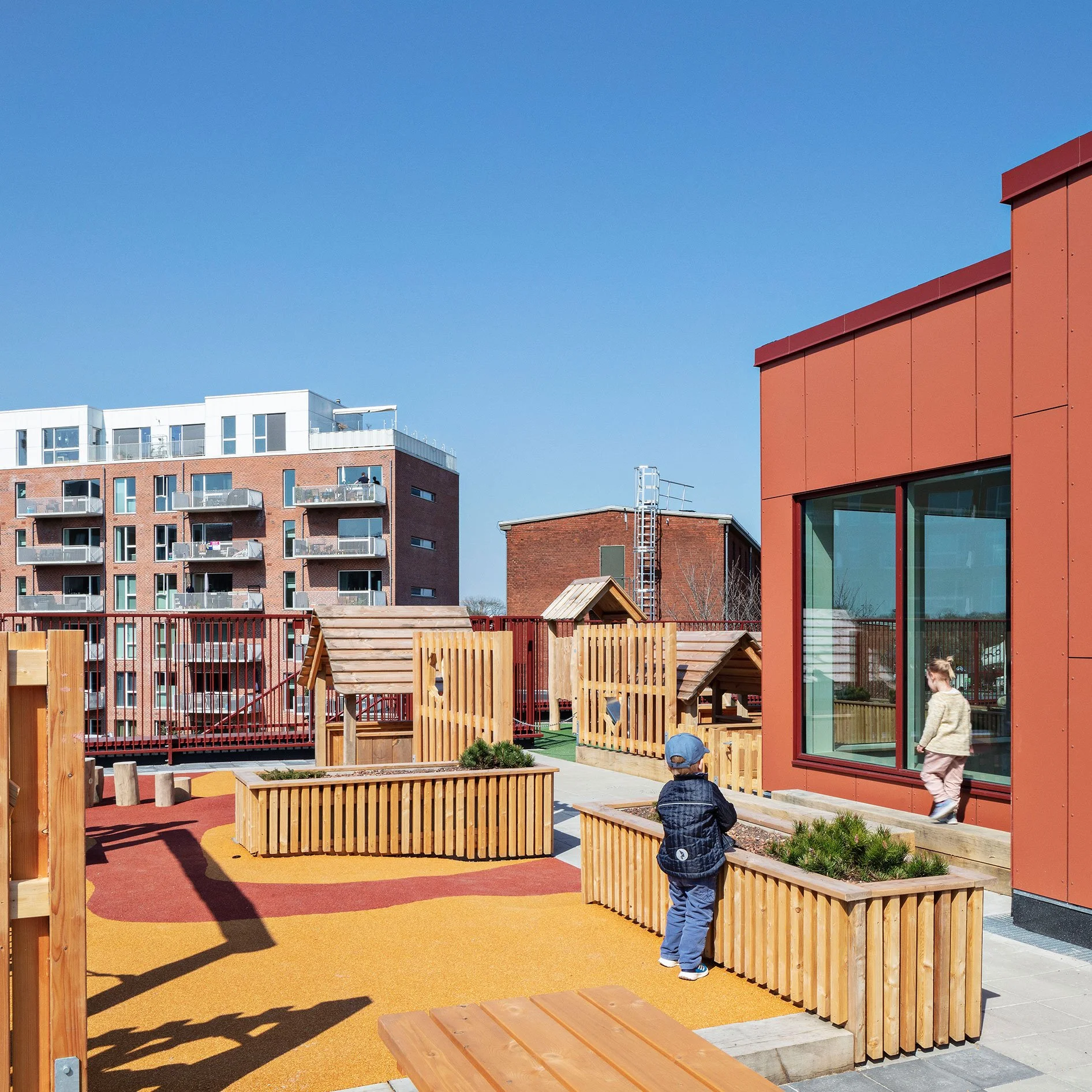 Vuggestuegruppernes primære legeareal er etableret på taget samt med et mindre område afskærmet og dedikeret til dem på terræn. Børnehavegruppernes udearealer ligger på terræn, hvor der er direkte adgang til rolige bygningsnære opholdsarealer fra samtlige stuer på denne etage. For udearealerne er princippet, at jo længere du bevæger dig væk fra bygningen, jo vildere bliver legen. På denne måde sikres de allermindste mere trygge og skærmede uderum samtidig med, at der på terræn gives god plads til de større børns behov for udviklende rum og udfordrende lege-elementer.