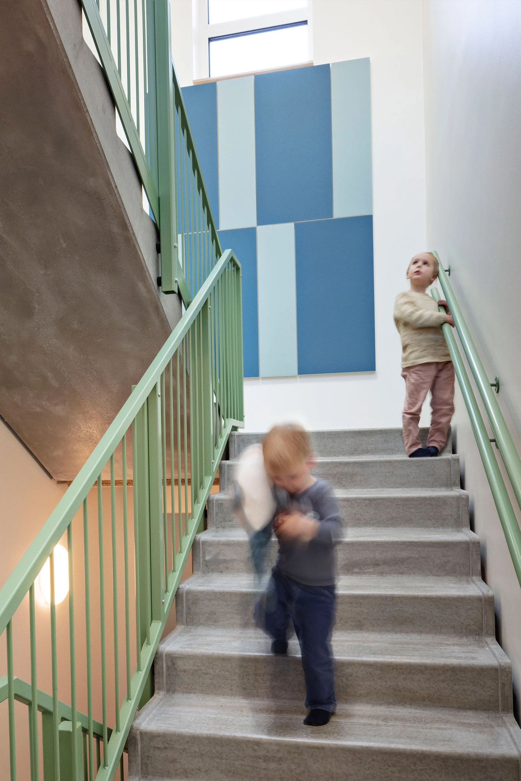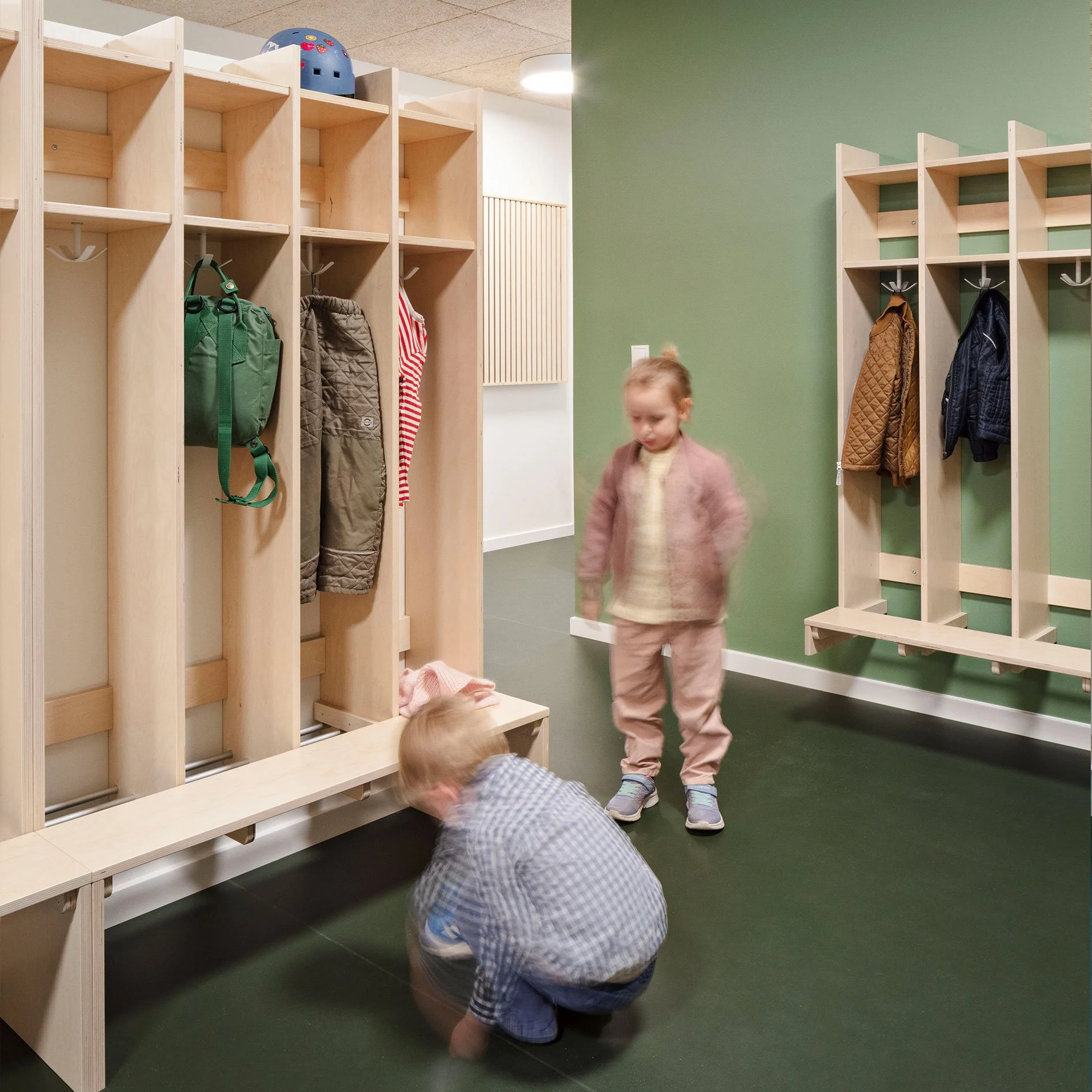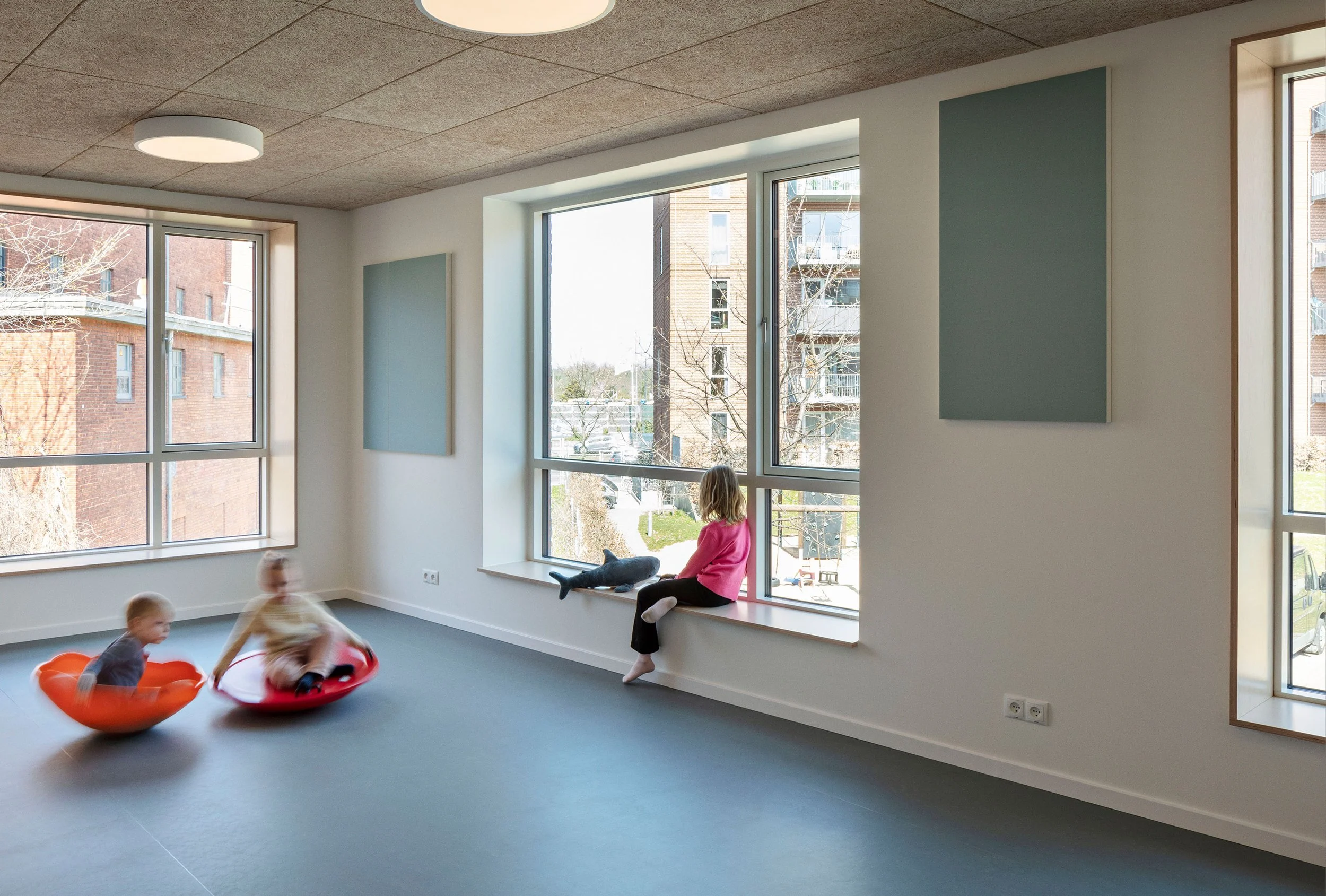 På både terræn og 1. sal sover de mindste lur i bygningsintegrerede liggehaller med en perforeret facade, der filtrerer dagslyset og giver en behagelig og passende sovestemning. Daginstitutionen er indrettet med fleksible faciliteter, så børnegrupperne kan ændres efter behov indenfor de eksisterende rammer.